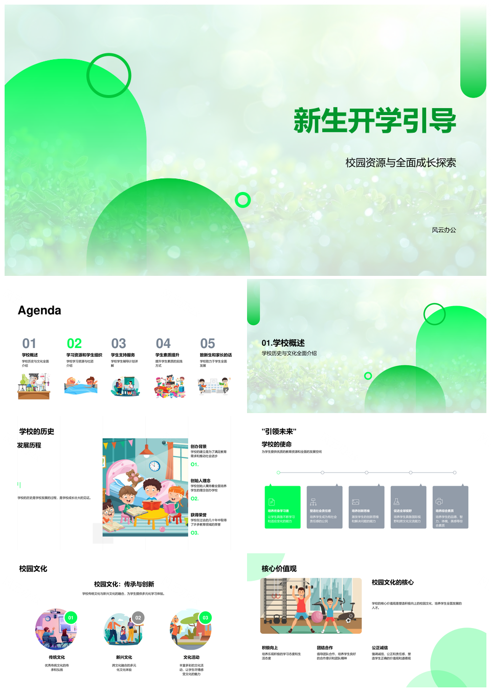 新生开学引导校园资源助力全面成长探索校史核心价值教育学习社团PPT模板推荐