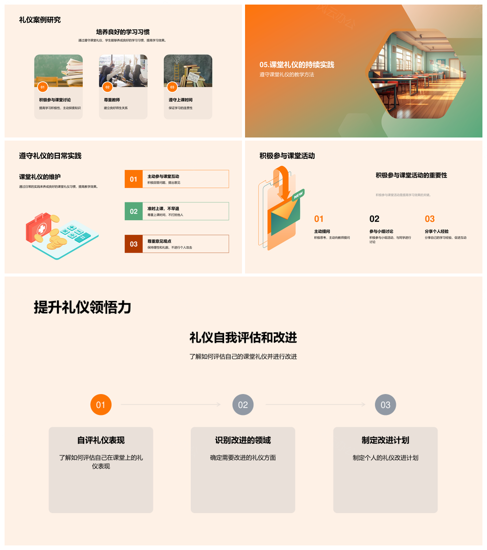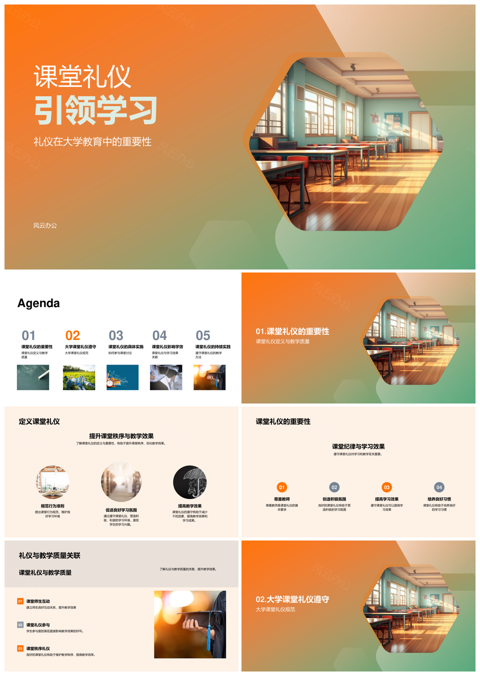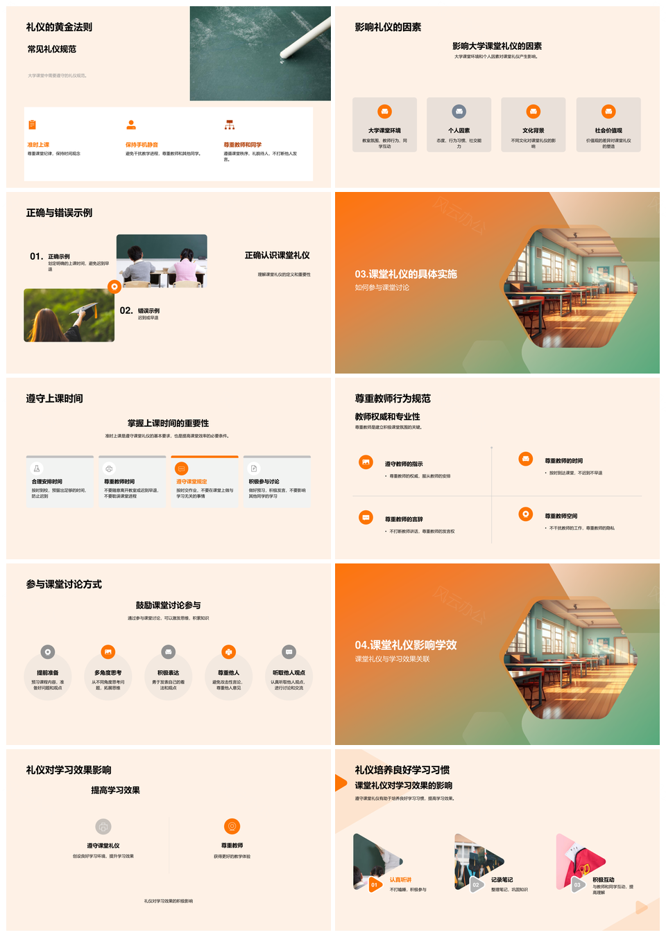 风云办公提供的课堂礼仪规范提升大学教学与学习效果PPT模板,下载格式为pptx,一共23页,作品中文字及图均可以修改和编辑,图片更改请在作品中右键图片并更换,文字修改请直接点击文字进行修改。