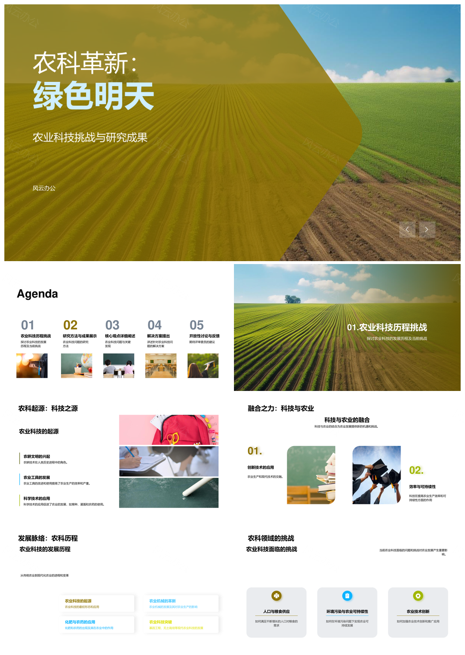 风云办公提供的农科革新研究助力绿色农业实践发展PPT模板,下载格式为pptx,一共30页,作品中文字及图均可以修改和编辑,图片更改请在作品中右键图片并更换,文字修改请直接点击文字进行修改。