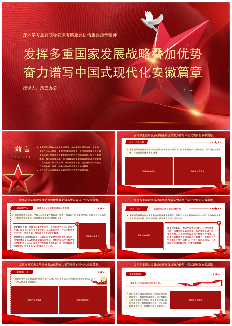 风云办公提供的安徽考察多重战略叠加优势谱写现代化篇章课件,下载格式为pptx,一共19页,作品中文字及图均可以修改和编辑,图片更改请在作品中右键图片并更换,文字修改请直接点击文字进行修改。