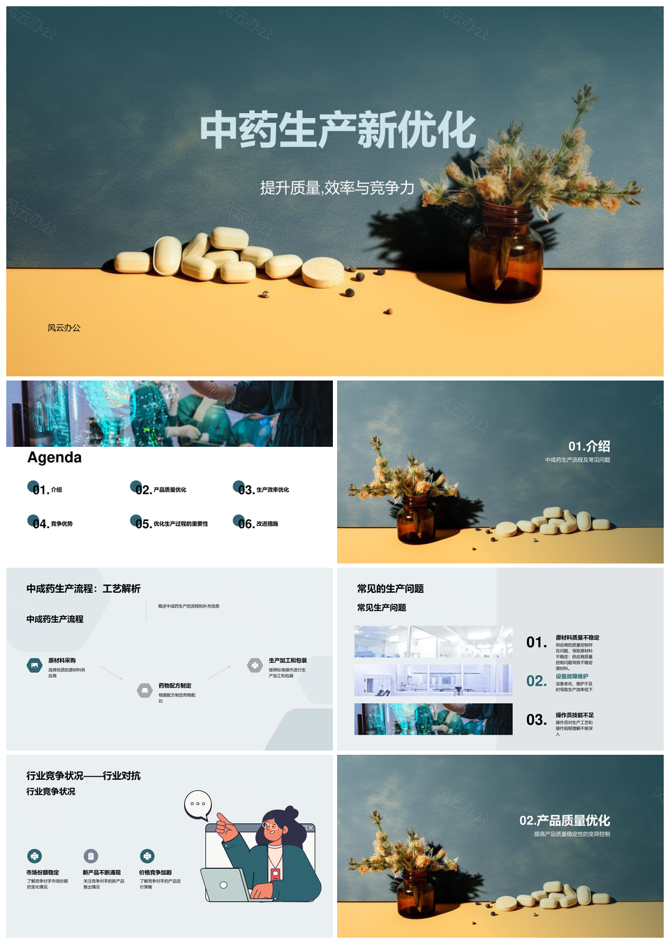 风云办公提供的中成药生产优化提质增效解决变异问题PPT模板,下载格式为pptx,一共25页,作品中文字及图均可以修改和编辑,图片更改请在作品中右键图片并更换,文字修改请直接点击文字进行修改。