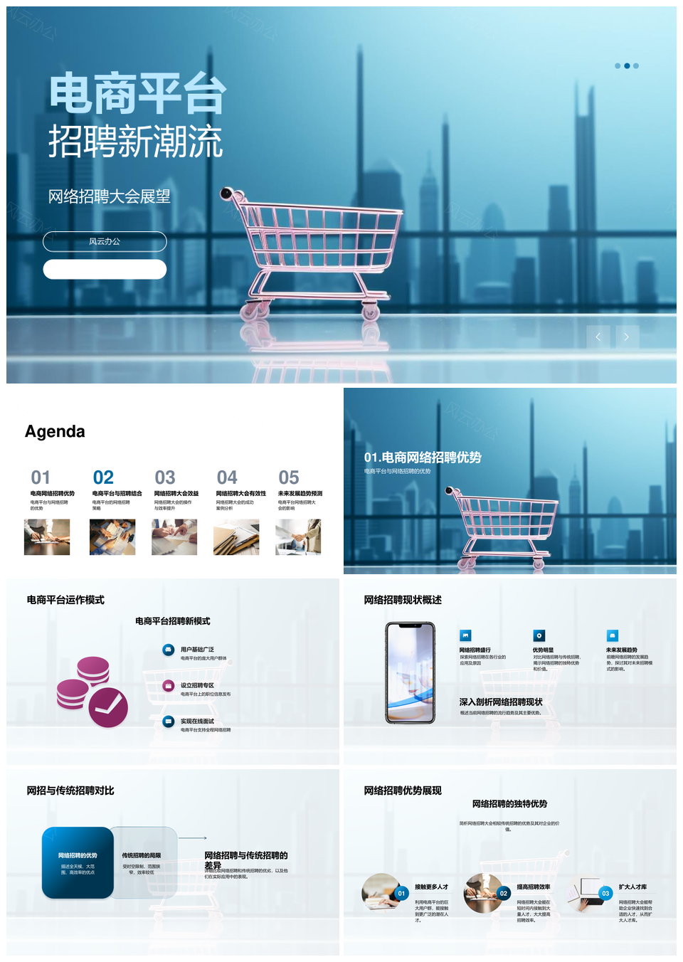 风云办公提供的电商平台网络招聘在线面试提效革新PPT模板,下载格式为pptx,一共28页,作品中文字及图均可以修改和编辑,图片更改请在作品中右键图片并更换,文字修改请直接点击文字进行修改。