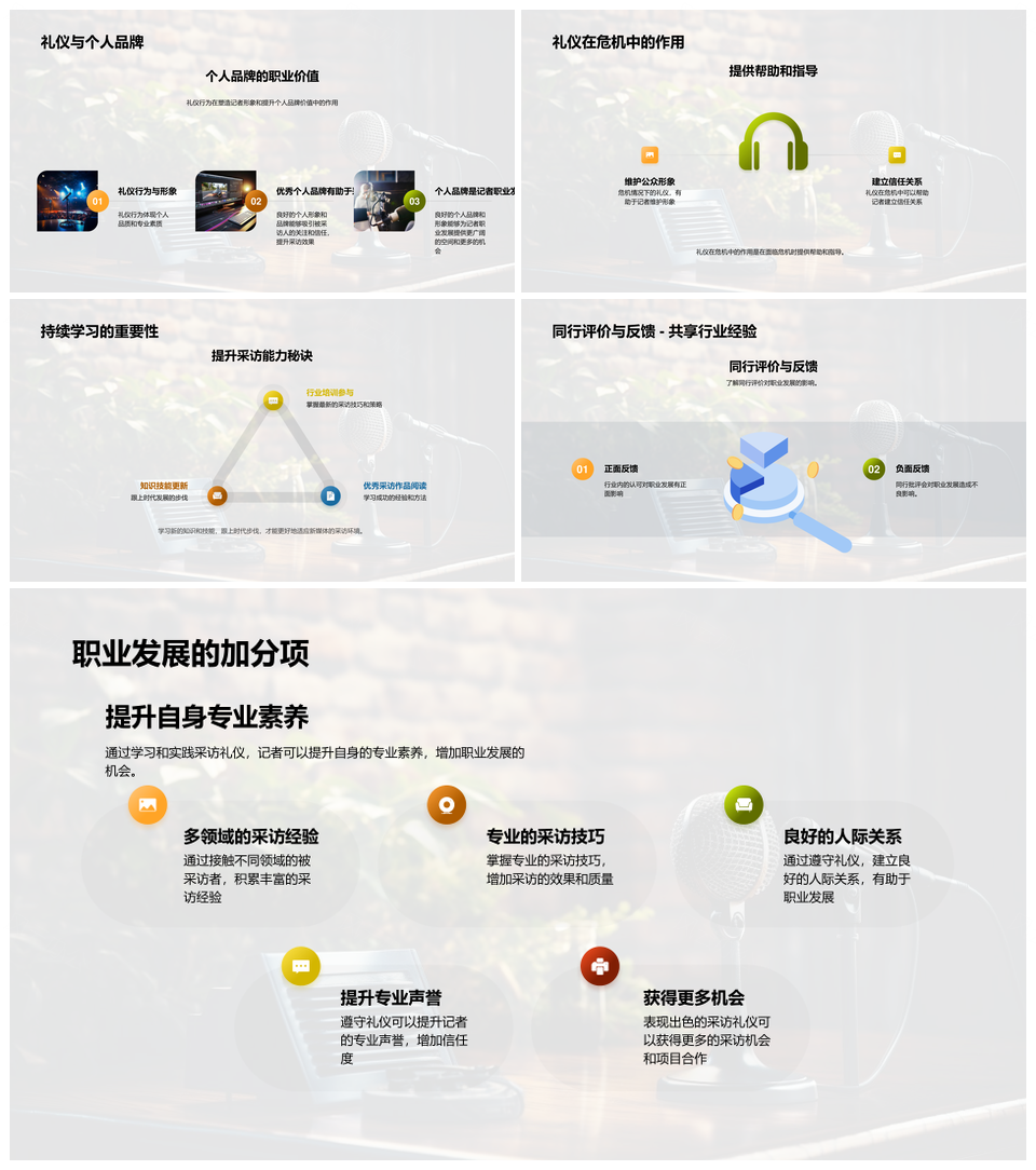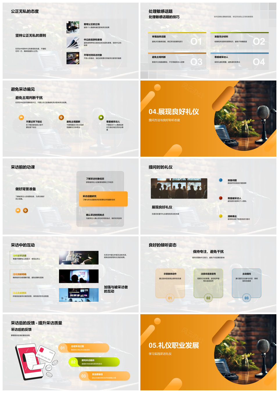 这是一张新晋记者采访礼仪策略流程职业形象公正PPT模板,包含新晋记者、采访、礼仪、策略、流程、职业形象、公正等主题内容,也可用作新晋记者采访礼仪、记者采访礼仪策略、采访礼仪策略流程、礼仪策略流程职业形象、策略流程职业形象公正、新晋记者礼仪策略、记者礼仪策略流程、礼仪策略职业形象、策略职业形象公正、新晋记者采访、记者采访礼仪、礼仪流程职业形象、流程职业形象公正、新晋记者、职业形象公正等PPT场景使用。 风云办公提供的新晋记者采访礼仪策略流程职业形象公正PPT模板,下载格式为pptx,一共33页,作品中文字及图均可以修改和编辑,图片更改请在作品中右键图片并更换,文字修改请直接点击文字进行修改。