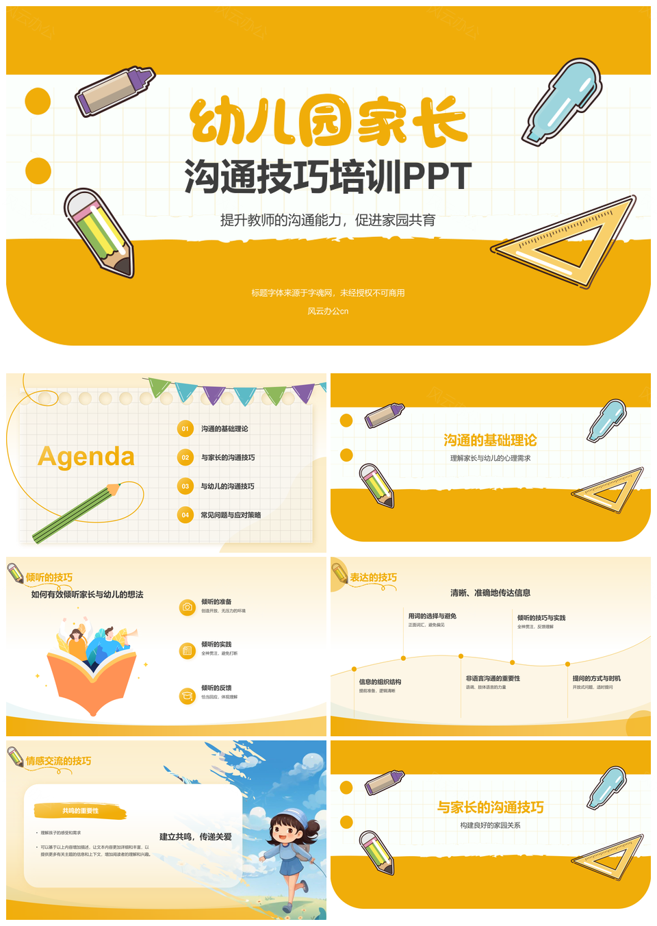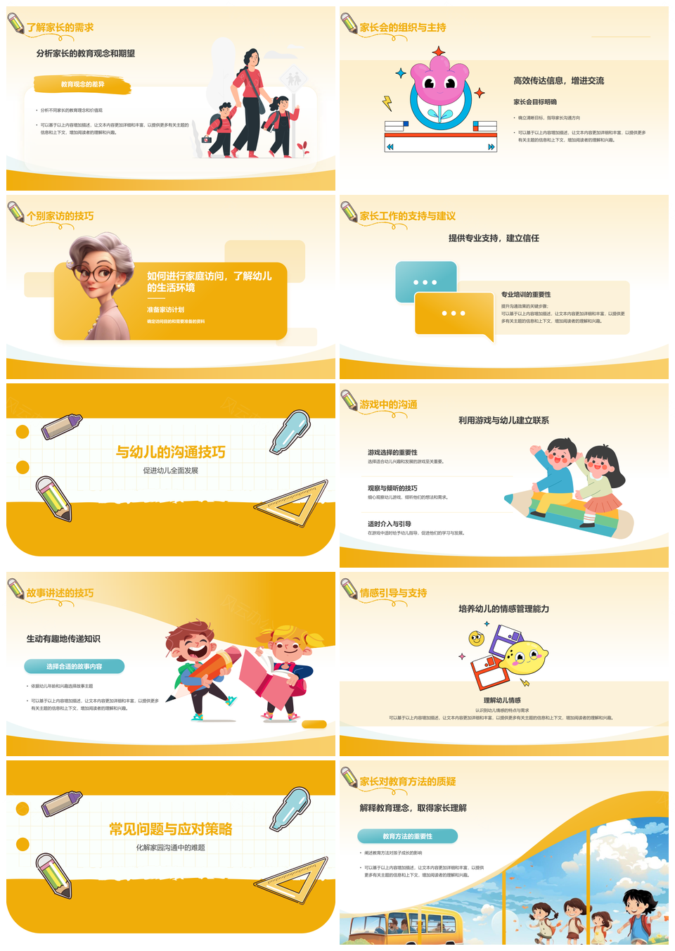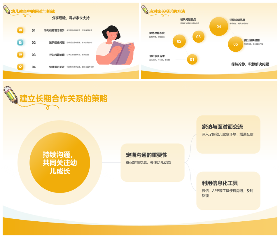 这是一张家园共育幼师家长沟通技巧能力提升培训PPT模板,包含家园共育、幼师、家长、沟通技巧、能力、提升、培训等主题内容,也可用作家园共育幼师家长沟通技巧、幼师家长沟通技巧能力、家长沟通技巧能力提升、沟通技巧能力提升培训、家园共育幼师家长、幼师家长沟通技巧、家长沟通技巧能力、沟通技巧能力提升、能力提升培训、家园共育沟通技巧、幼师家长能力提升、沟通技巧提升培训、幼师家长沟通、家长能力提升、沟通技巧提升等PPT场景使用。 风云办公提供的家园共育幼师家长沟通技巧能力提升培训PPT模板,下载格式为pptx,一共21页,作品中文字及图均可以修改和编辑,图片更改请在作品中右键图片并更换,文字修改请直接点击文字进行修改。