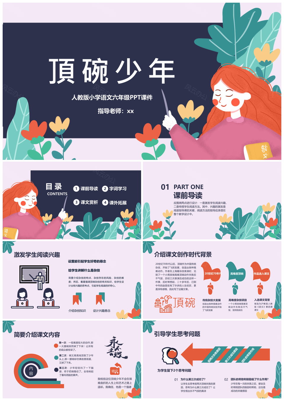 风云办公提供的人教版小学语文六年级课件顶碗少年PPT模板,下载格式为pptx,一共24页,作品中文字及图均可以修改和编辑,图片更改请在作品中右键图片并更换,文字修改请直接点击文字进行修改。
