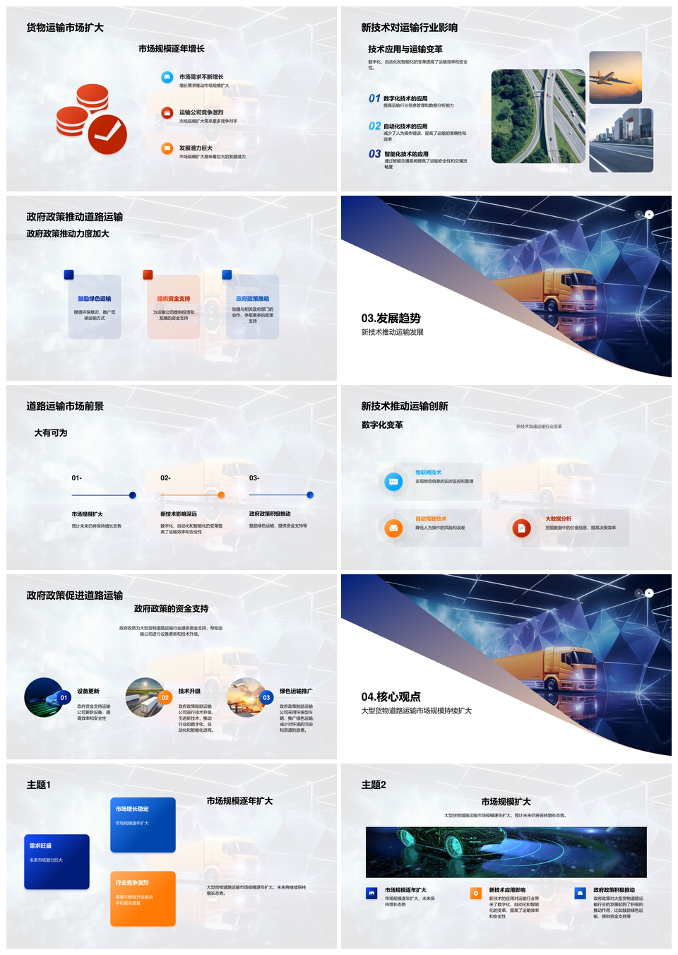 这是一张货运智慧化与道路运输数字化革新驱动市场扩容PPT模板,包含货运智慧化、道路运输、数字化、革新、驱动、市场扩容等主题内容,也可用作货运智慧化道路运输数字化革新驱动、货运智慧化驱动市场扩容、道路运输数字化革新驱动、道路运输数字化革新、数字化革新驱动、革新驱动市场扩容、货运智慧化道路运输、智慧化道路运输数字化、货运智慧化市场扩容、道路运输驱动市场扩容、智慧化驱动市场扩容、货运智慧化、道路运输数字化、数字化革新、革新驱动、驱动市场扩容等PPT场景使用。 风云办公提供的货运智慧化与道路运输数字化革新驱动市场扩容PPT模板,下载格式为pptx,一共25页,作品中文字及图均可以修改和编辑,图片更改请在作品中右键图片并更换,文字修改请直接点击文字进行修改。