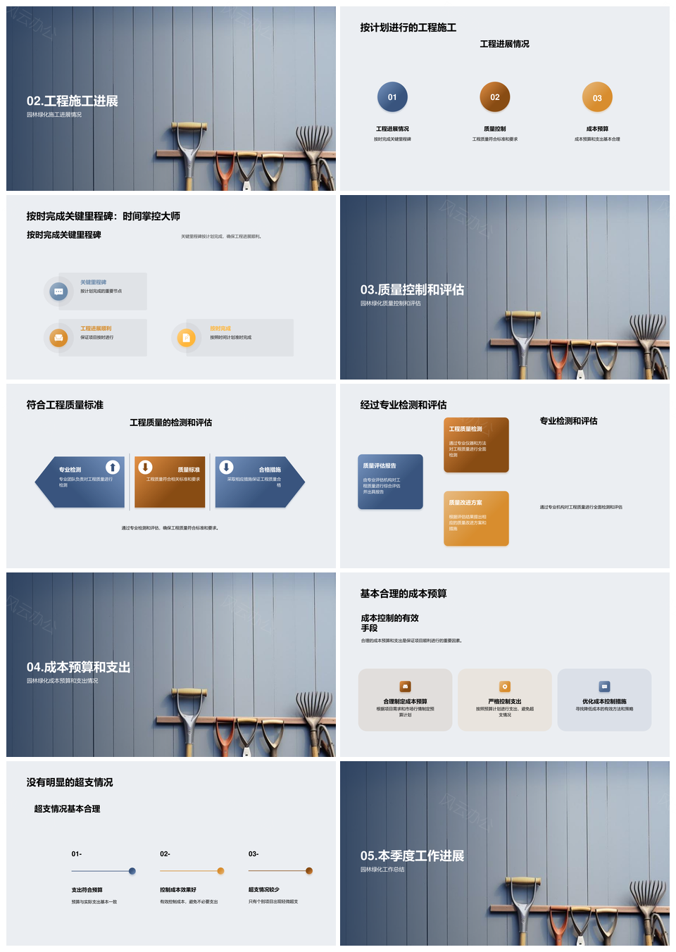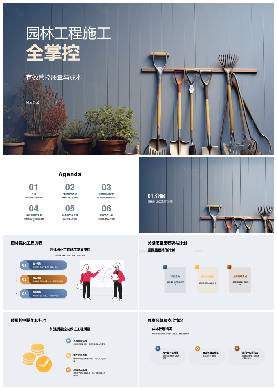 这是一张园林施工项目经理全控绿化质量成本流程步骤PPT模板,包含园林施工、项目经理、全控、绿化质量、成本、流程、步骤等主题内容,也可用作园林施工项目经理全控、项目经理全控绿化质量、全控绿化质量成本、绿化质量成本流程、质量成本流程步骤、园林施工项目经理、项目经理全控绿化、施工项目经理全控、全控绿化质量、绿化质量成本、质量成本流程、成本流程步骤、园林施工、项目经理全控、绿化质量等PPT场景使用。 风云办公提供的园林施工项目经理全控绿化质量成本流程步骤PPT模板,下载格式为pptx,一共25页,作品中文字及图均可以修改和编辑,图片更改请在作品中右键图片并更换,文字修改请直接点击文字进行修改。