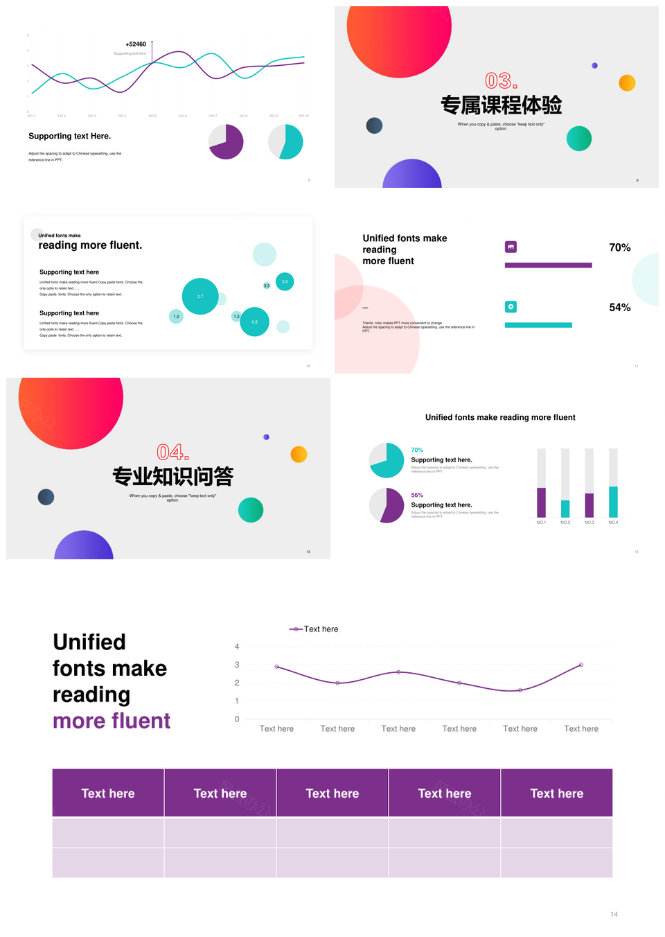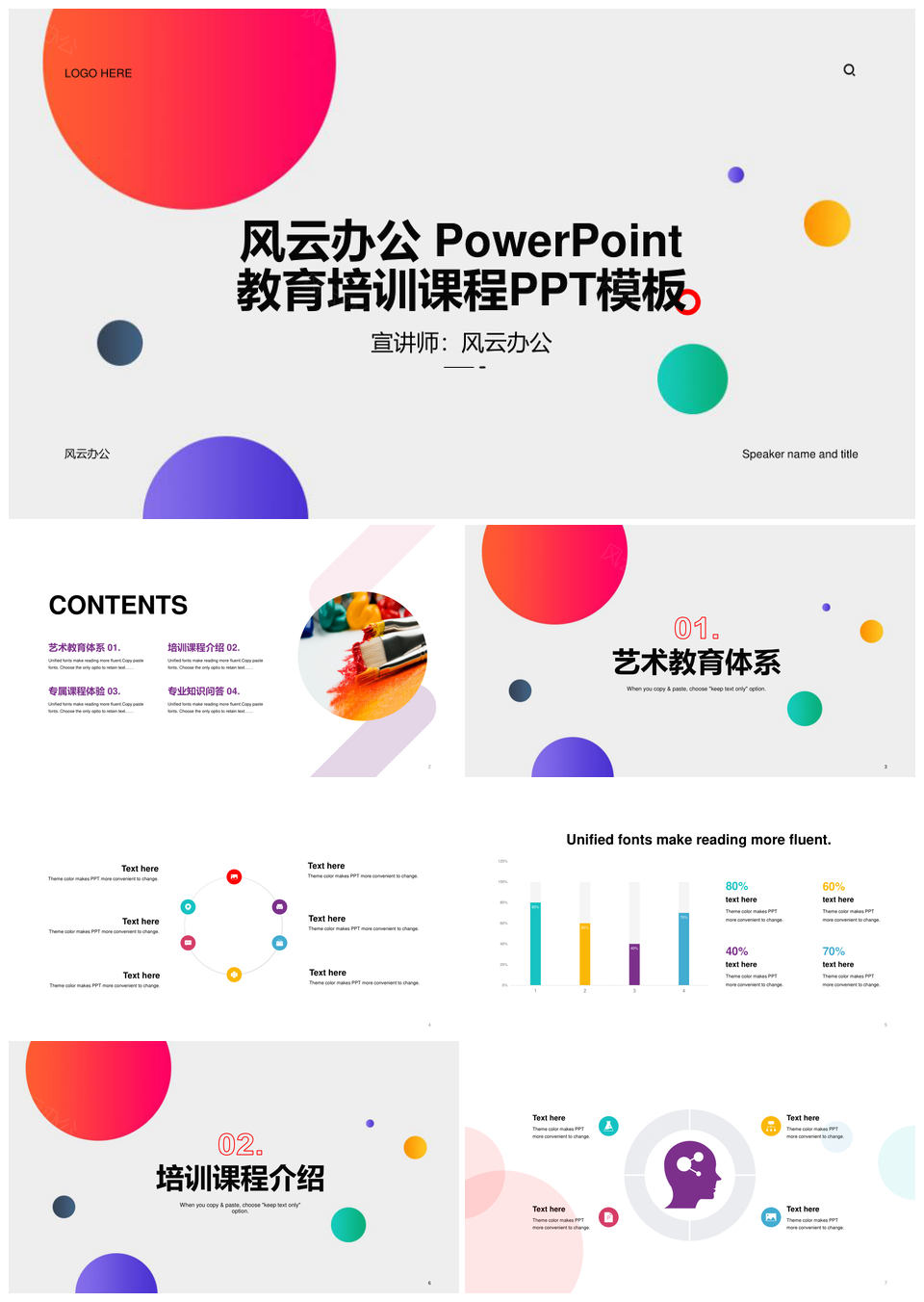 风云办公提供的多色扁平时尚简约创意培训课件PPT模板,下载格式为pptx,一共15页,作品中文字及图均可以修改和编辑,图片更改请在作品中右键图片并更换,文字修改请直接点击文字进行修改。