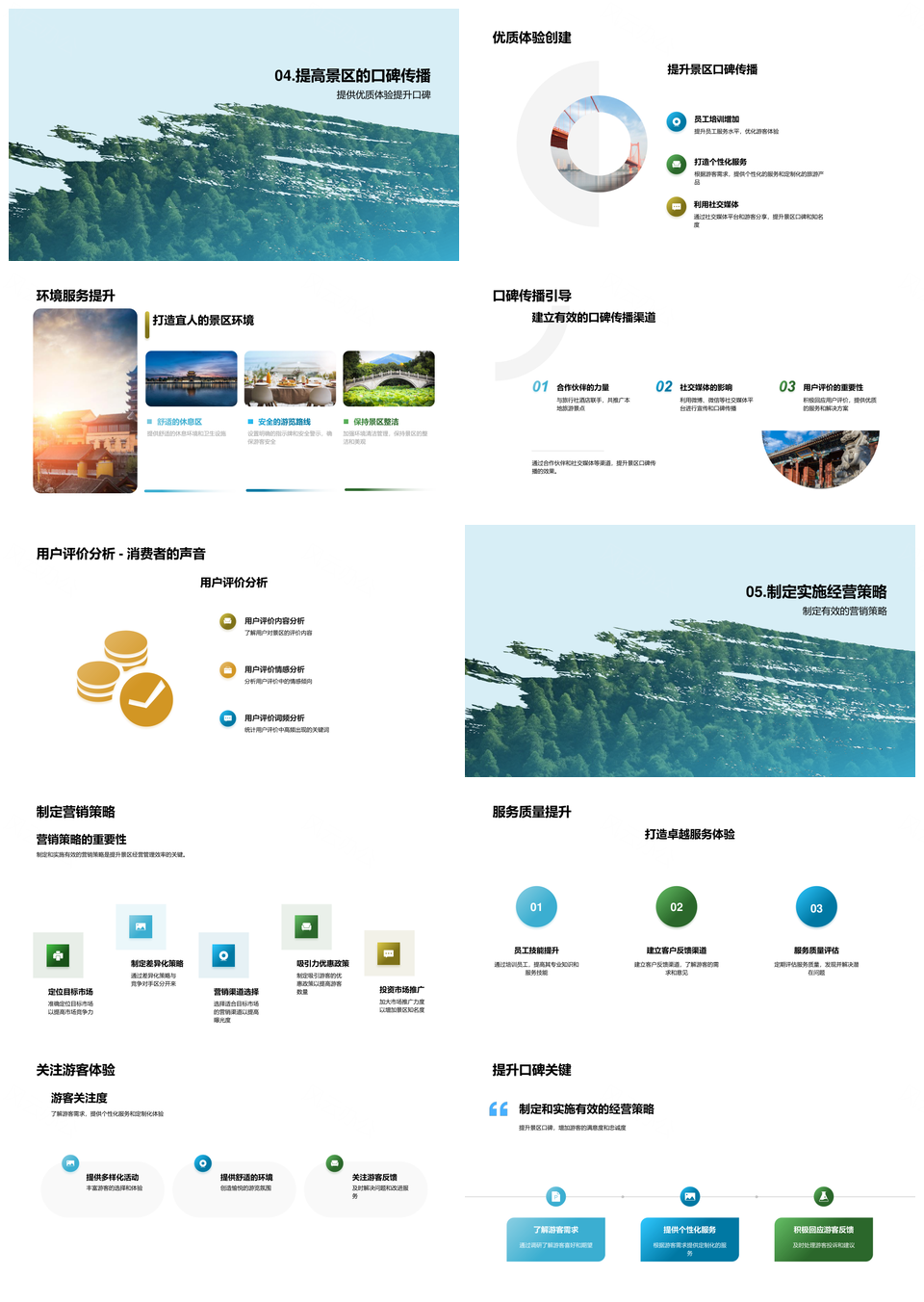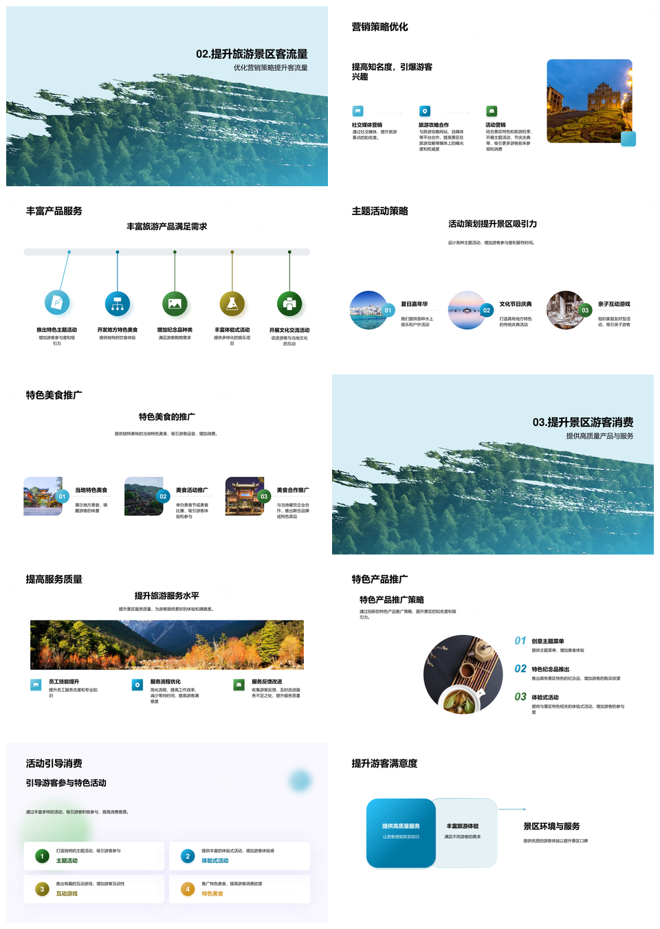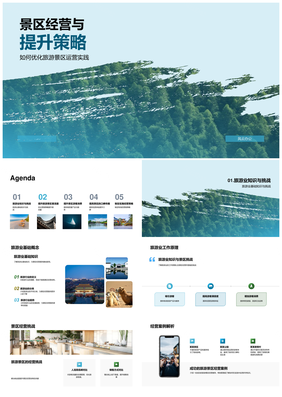 风云办公提供的旅游景区运营提升与山景美食营销策略PPT模板,下载格式为pptx,一共28页,作品中文字及图均可以修改和编辑,图片更改请在作品中右键图片并更换,文字修改请直接点击文字进行修改。