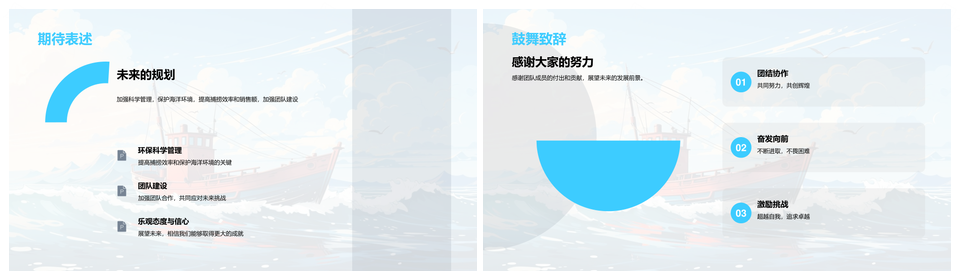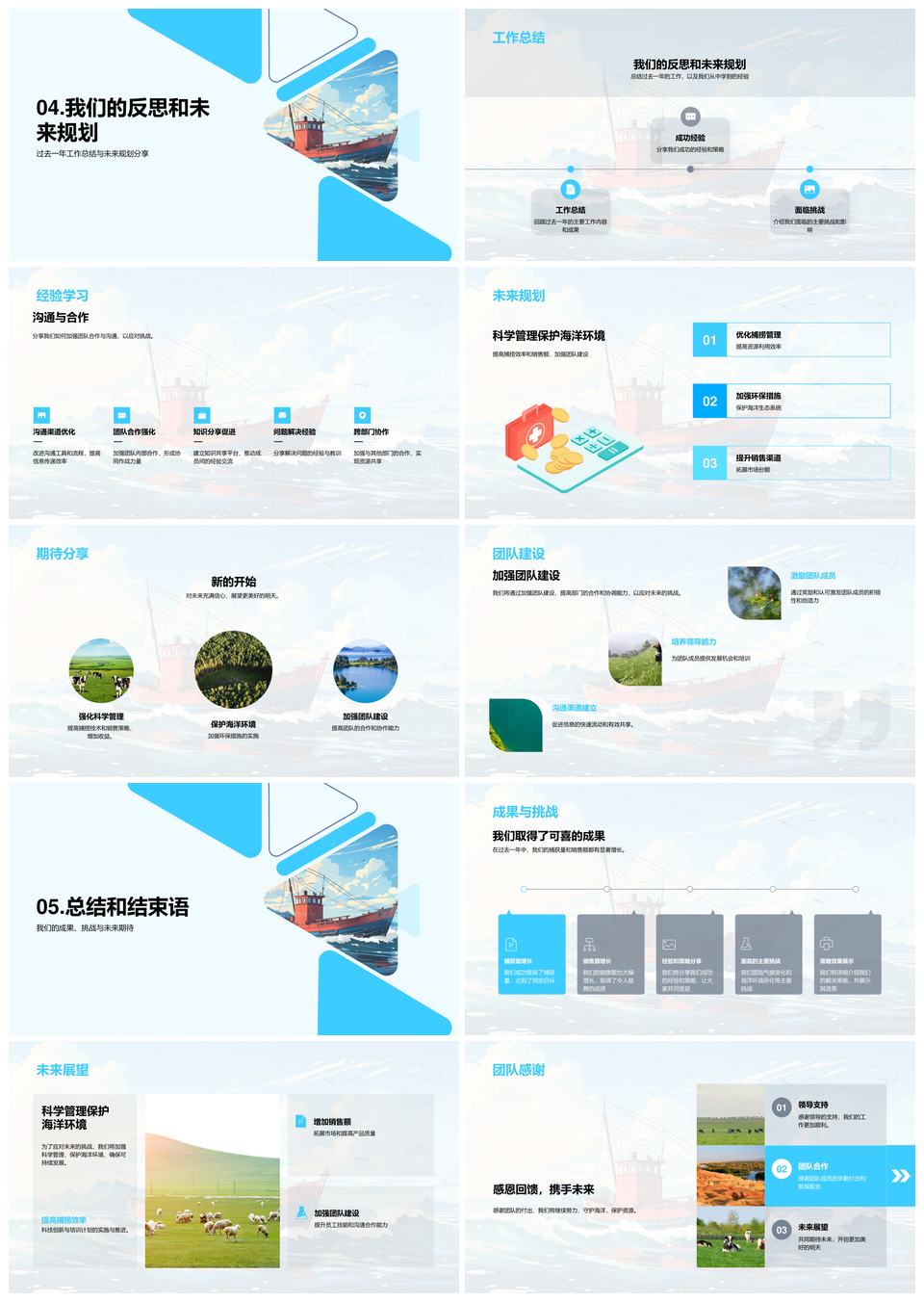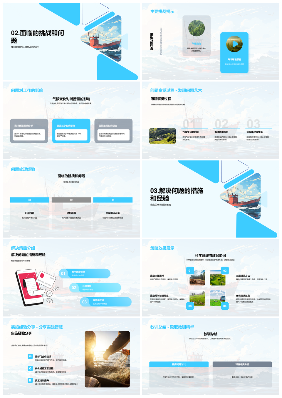 这是一张渔业环保科学管理增产护海洋PPT模板,包含渔业、环保、科学、管理、增产、护海洋等主题内容,也可用作渔业环保科学管理、环保科学管理增产、渔业环保科学、环保科学管理、科学管理增产、渔业环保、环保科学、科学管理、管理增产、增产海洋、环保管理、科学增产、管理海洋、渔业科学、渔业管理等PPT场景使用。 风云办公提供的渔业环保科学管理增产护海洋PPT模板,下载格式为pptx,一共30页,作品中文字及图均可以修改和编辑,图片更改请在作品中右键图片并更换,文字修改请直接点击文字进行修改。