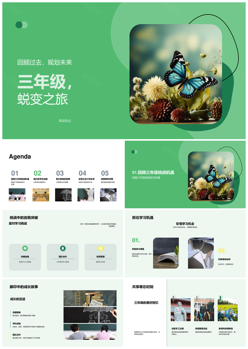 风云办公提供的三年级蜕变之旅迎挑战机遇化蝶成长PPT模板,下载格式为pptx,一共28页,作品中文字及图均可以修改和编辑,图片更改请在作品中右键图片并更换,文字修改请直接点击文字进行修改。
