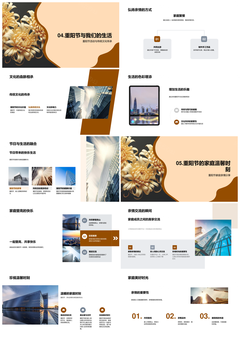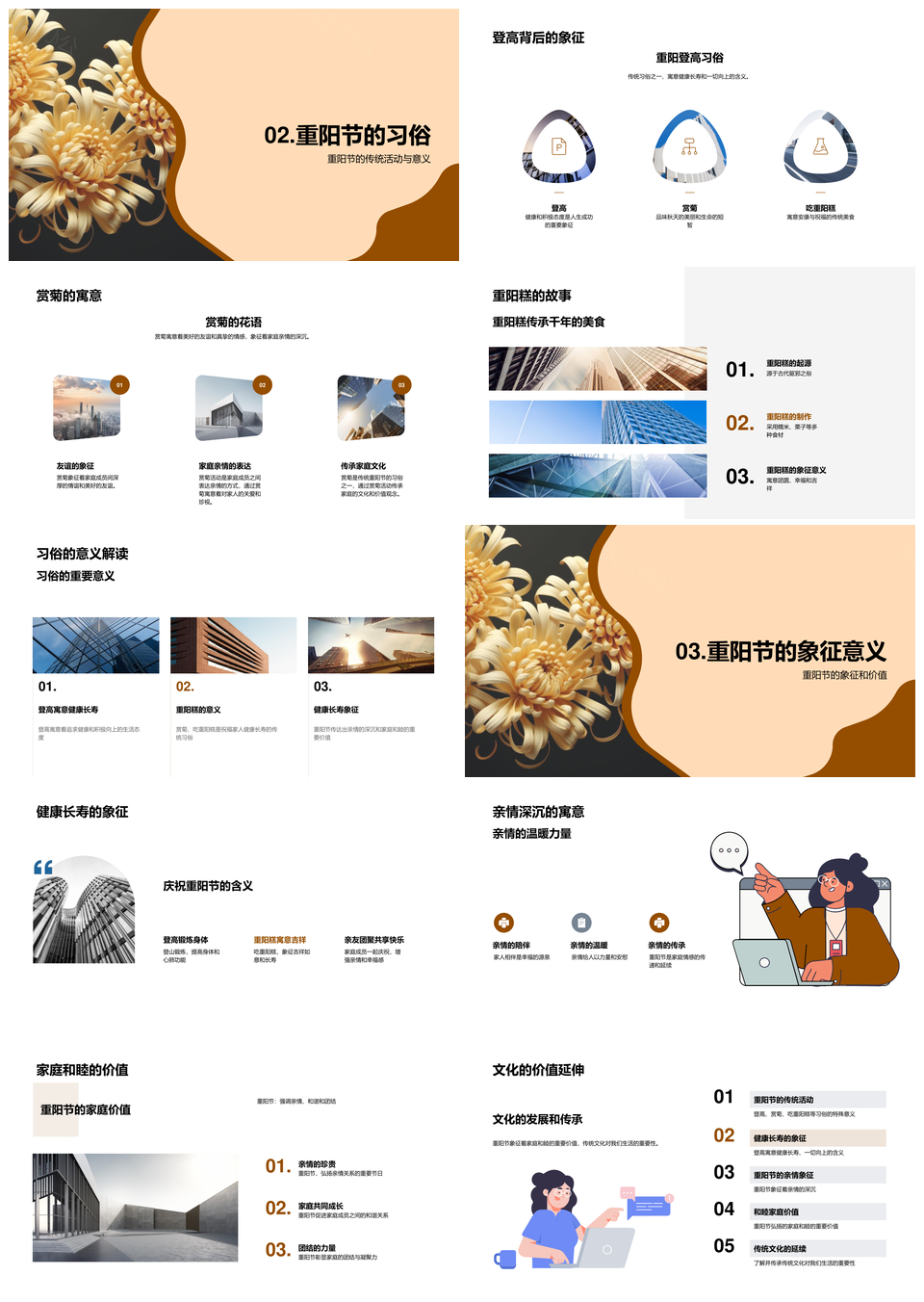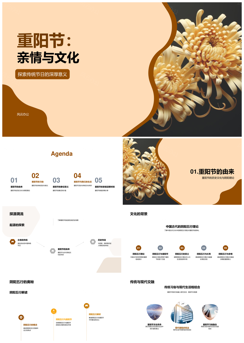这是一张重阳节亲情文化登高赏菊重阳糕阴阳五行历史PPT模板,包含重阳节、亲情、文化、登高、赏菊、重阳糕、阴阳、五行、历史等主题内容,也可用作登高赏菊重阳糕阴阳五行、重阳节亲情文化登高、登高赏菊重阳糕、重阳节登高赏菊、赏菊重阳糕阴阳五行、重阳糕阴阳五行历史、重阳节亲情文化、登高赏菊、赏菊重阳糕、阴阳五行历史、亲情文化、文化登高、重阳节登高、重阳节亲情、历史阴阳五行等PPT场景使用。 风云办公提供的重阳节亲情文化登高赏菊重阳糕阴阳五行历史PPT模板,下载格式为pptx,一共28页,作品中文字及图均可以修改和编辑,图片更改请在作品中右键图片并更换,文字修改请直接点击文字进行修改。
