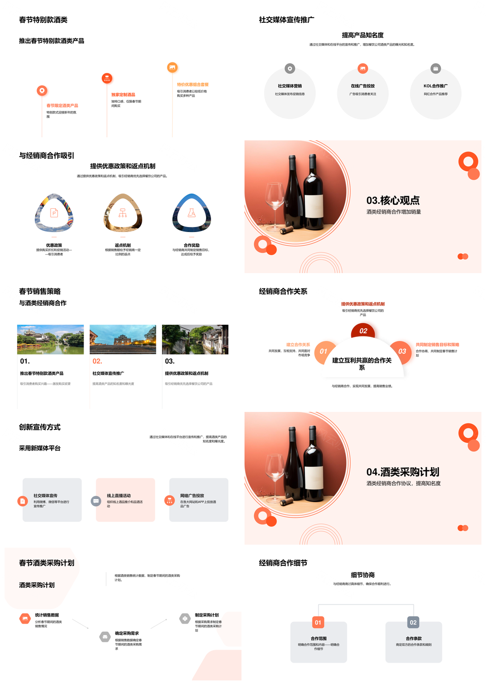 这是一张春节酒类营销经理餐饮酒商销售策略竞争战PPT模板,包含春节、酒类、营销经理、餐饮、酒商、销售策略、竞争战等主题内容,也可用作春节酒类营销经理餐饮酒商、酒类营销经理餐饮酒商销售策略、营销经理餐饮酒商销售策略竞争战、春节餐饮酒商销售策略竞争战、春节酒类营销经理销售策略、春节酒类餐饮酒商销售策略、酒类营销经理销售策略竞争战、营销经理餐饮酒商竞争战、餐饮酒商销售策略竞争战、春节酒类营销经理、酒类营销经理餐饮酒商、餐饮酒商销售策略、销售策略竞争战、春节酒类餐饮酒商、酒类营销经理销售策略等PPT场景使用。 风云办公提供的春节酒类营销经理餐饮酒商销售策略竞争战PPT模板,下载格式为pptx,一共19页,作品中文字及图均可以修改和编辑,图片更改请在作品中右键图片并更换,文字修改请直接点击文字进行修改。