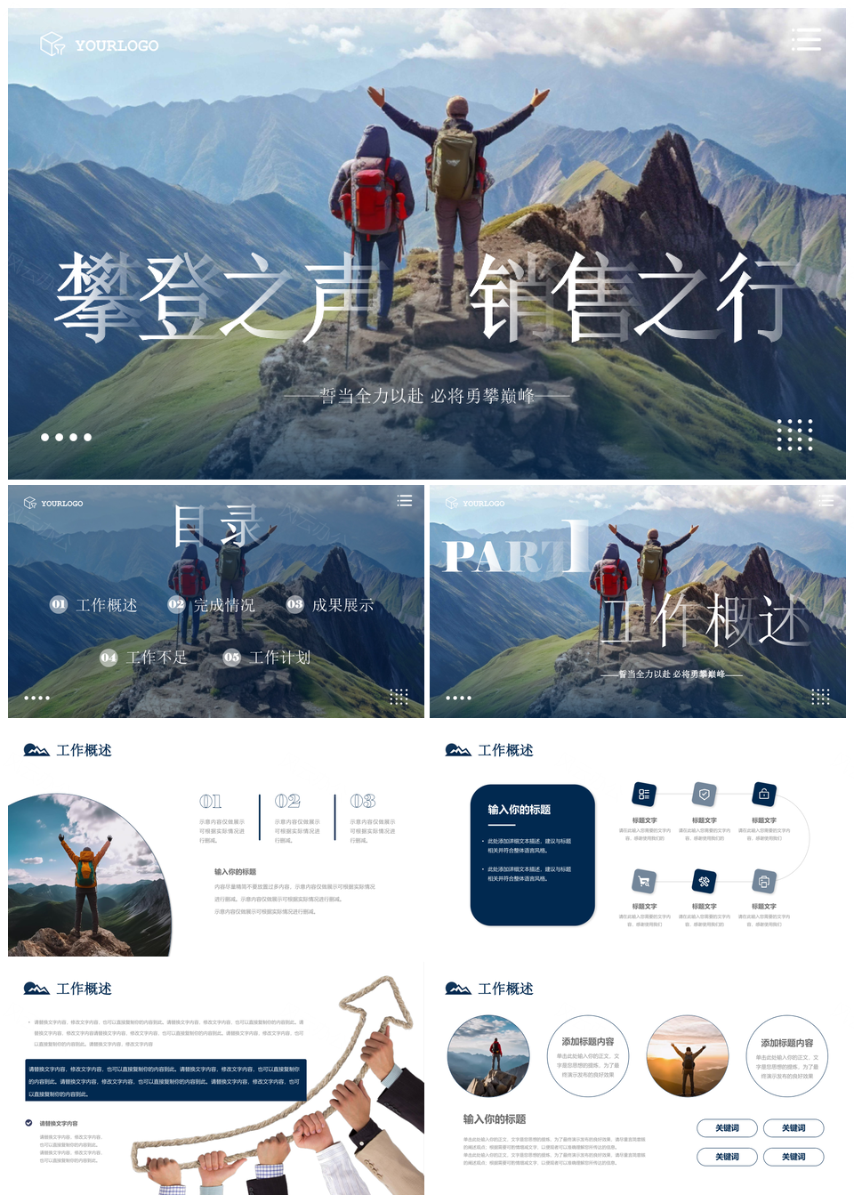 这是一张公司销售励志攀登实拍工作总结领导之声PPT模板,包含公司、销售、励志、攀登、实拍、工作、总结、领导、之声、工作总结等主题内容,也可用作公司销售励志攀登、励志攀登实拍工作、攀登实拍工作总结、工作总结领导之声、公司销售励志、销售励志攀登、励志攀登实拍、攀登实拍工作、实拍工作总结、总结领导之声、公司销售、销售励志、励志攀登、攀登实拍、实拍工作等PPT场景使用。 风云办公提供的公司销售励志攀登实拍工作总结领导之声PPT模板,下载格式为pptx,一共28页,作品中文字及图均可以修改和编辑,图片更改请在作品中右键图片并更换,文字修改请直接点击文字进行修改。
