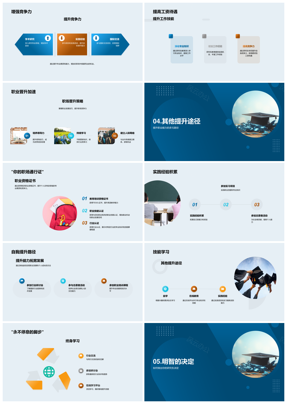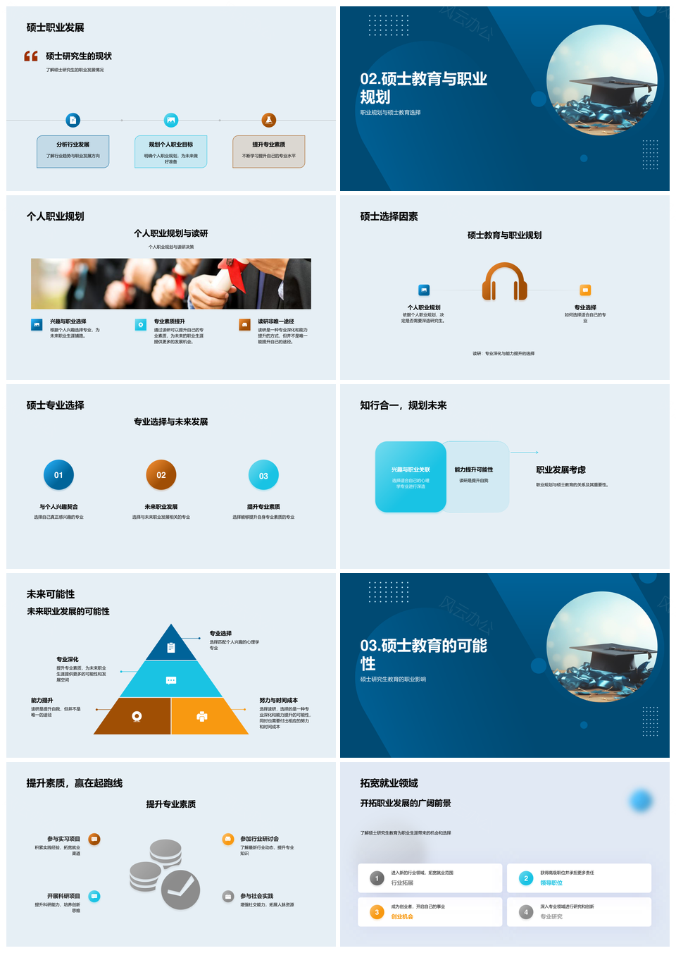 这是一张硕士教育职业规划与专业发展PPT模板,包含硕士教育、职业规划、专业发展等主题内容,也可用作硕士教育职业规划专业发展、硕士教育职业规划、硕士教育专业发展、教育职业规划专业发展、硕士职业规划专业发展、硕士教育、职业规划专业发展、教育职业规划、硕士专业发展、教育专业发展、硕士职业规划等PPT场景使用。 风云办公提供的硕士教育职业规划与专业发展PPT模板,下载格式为pptx,一共33页,作品中文字及图均可以修改和编辑,图片更改请在作品中右键图片并更换,文字修改请直接点击文字进行修改。