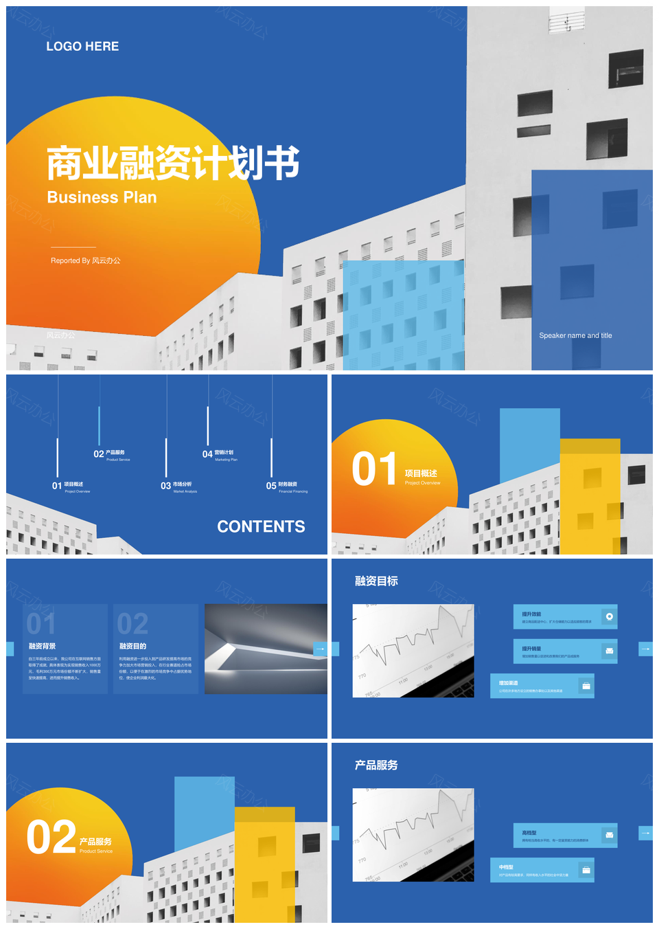 蓝黄红几何构建创意商业融资计划书PPT模板