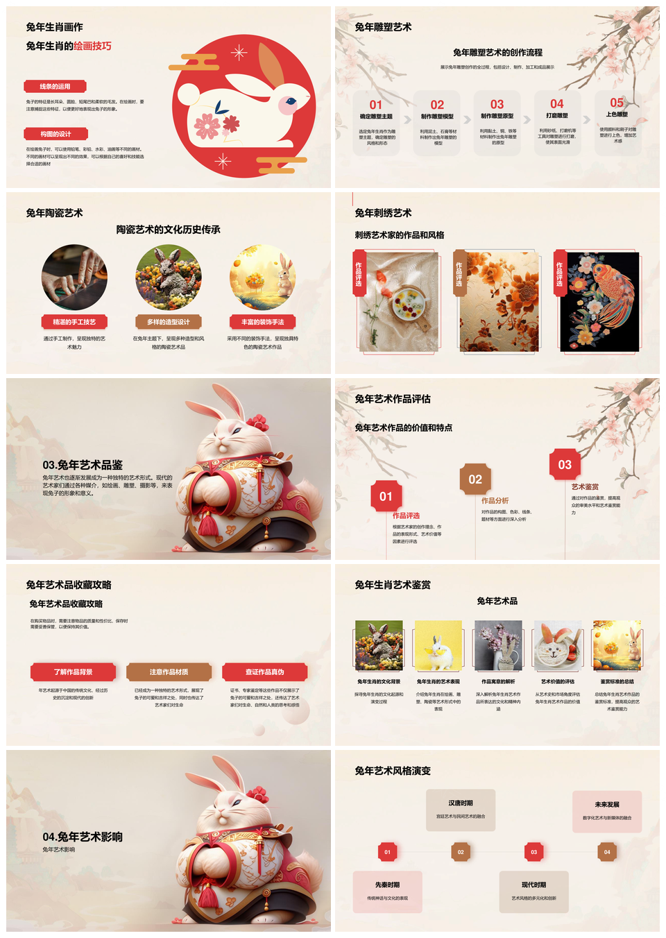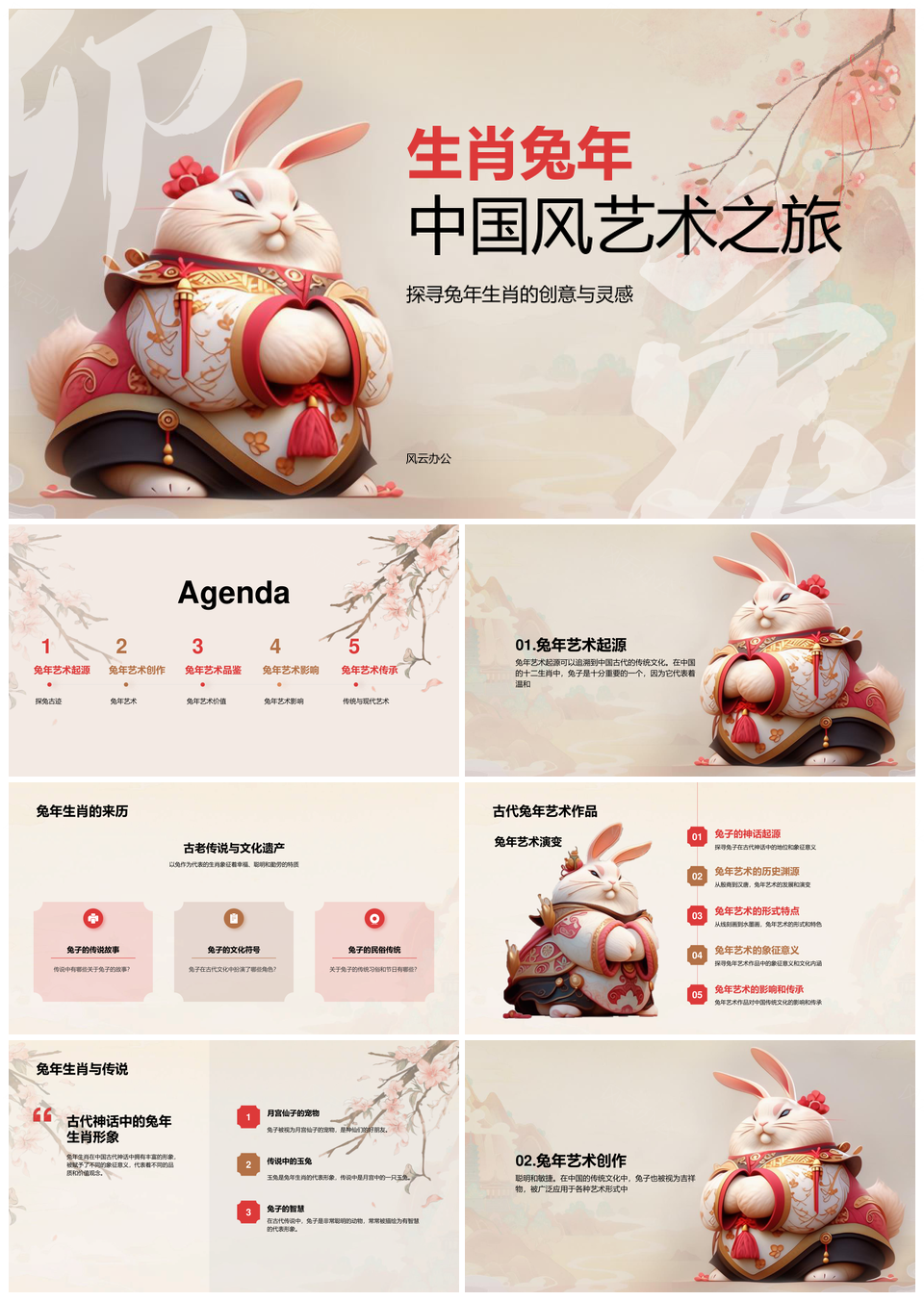 风云办公提供的复古国风金色生肖兔艺术之旅PPT模板,下载格式为pptx,一共20页,作品中文字及图均可以修改和编辑,图片更改请在作品中右键图片并更换,文字修改请直接点击文字进行修改。