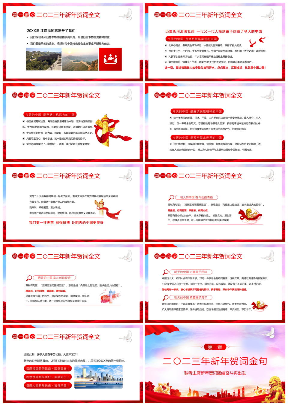 这是一张2023习近平新年贺词党建中国更美好PPT模板,包含2023、习近平、新年贺词、党建、中国、更美好等主题内容,也可用作2023、习近平、新年贺词、党建、中国、更美好 2023习近平新年贺词党建、习近平新年贺词党建中国、新年贺词党建中国更美好、2023习近平新年贺词、习近平新年贺词党建、新年贺词党建中国、党建中国更美好、2023习近平、习近平新年贺词、新年贺词党建、党建中国、中国更美好等PPT场景使用。 风云办公提供的2023习近平新年贺词党建中国更美好PPT模板,下载格式为pptx,一共22页,作品中文字及图均可以修改和编辑,图片更改请在作品中右键图片并更换,文字修改请直接点击文字进行修改。