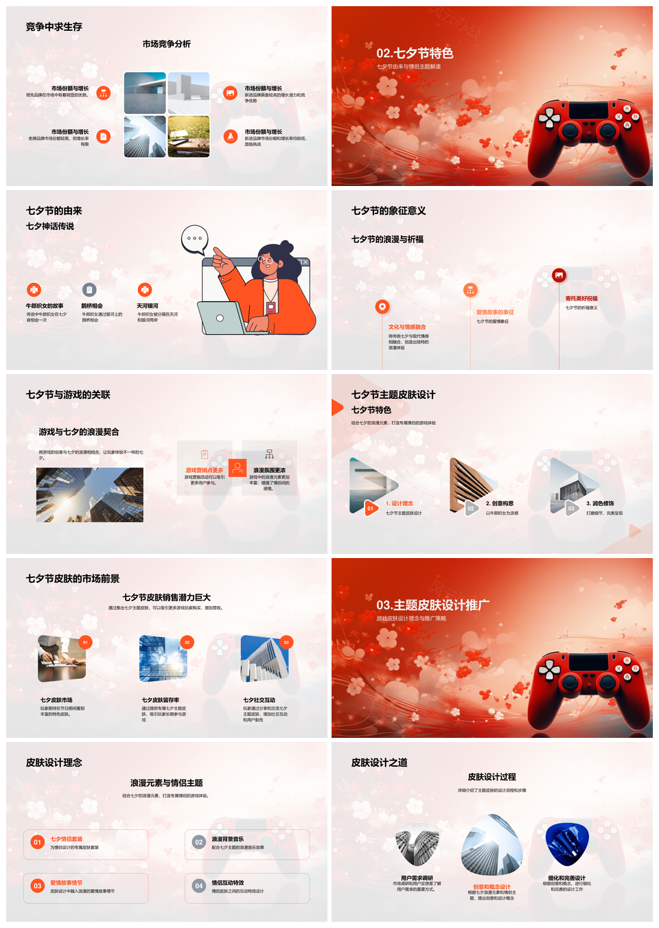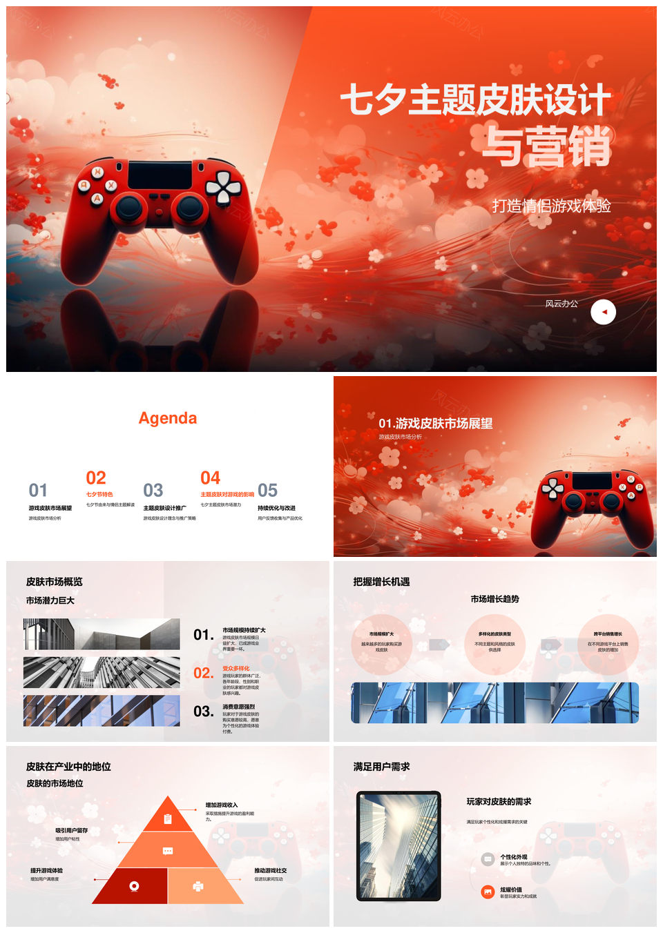 风云办公提供的七夕情侣游戏主题皮肤营销助力营收PPT模板,下载格式为pptx,一共33页,作品中文字及图均可以修改和编辑,图片更改请在作品中右键图片并更换,文字修改请直接点击文字进行修改。