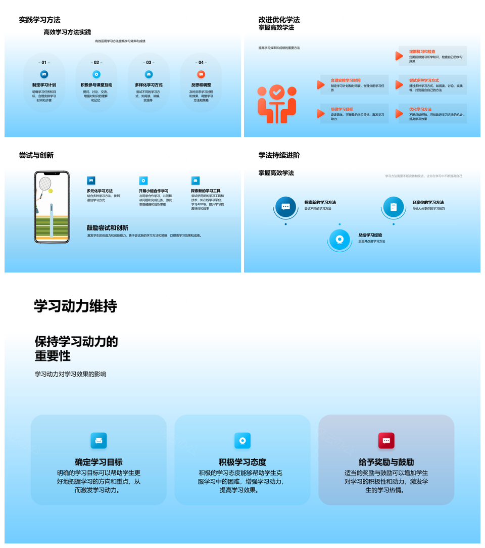 这是一张高效学习方法效率习惯工具时间管理实践报告PPT模板,包含高效学习方法、效率习惯、工具、时间管理、实践报告等主题内容,也可用作高效学习方法效率习惯工具时间管理、高效学习方法效率习惯、高效学习时间管理实践报告、时间管理实践报告高效学习、方法效率习惯工具时间管理、效率习惯工具时间管理实践、工具时间管理实践报告、高效学习方法效率、方法效率习惯工具、效率习惯工具时间管理、工具时间管理实践、时间管理实践报告、高效学习方法、方法效率、时间管理实践等PPT场景使用。 风云办公提供的高效学习方法效率习惯工具时间管理实践报告PPT模板,下载格式为pptx,一共33页,作品中文字及图均可以修改和编辑,图片更改请在作品中右键图片并更换,文字修改请直接点击文字进行修改。