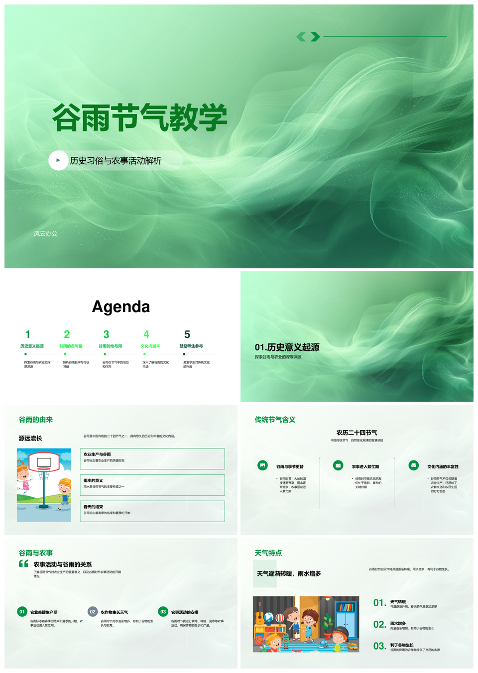 风云办公提供的谷雨节气农事习俗与种植教学PPT模板,下载格式为pptx,一共31页,作品中文字及图均可以修改和编辑,图片更改请在作品中右键图片并更换,文字修改请直接点击文字进行修改。