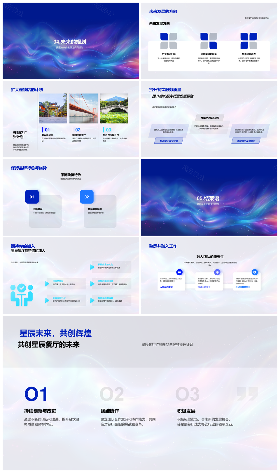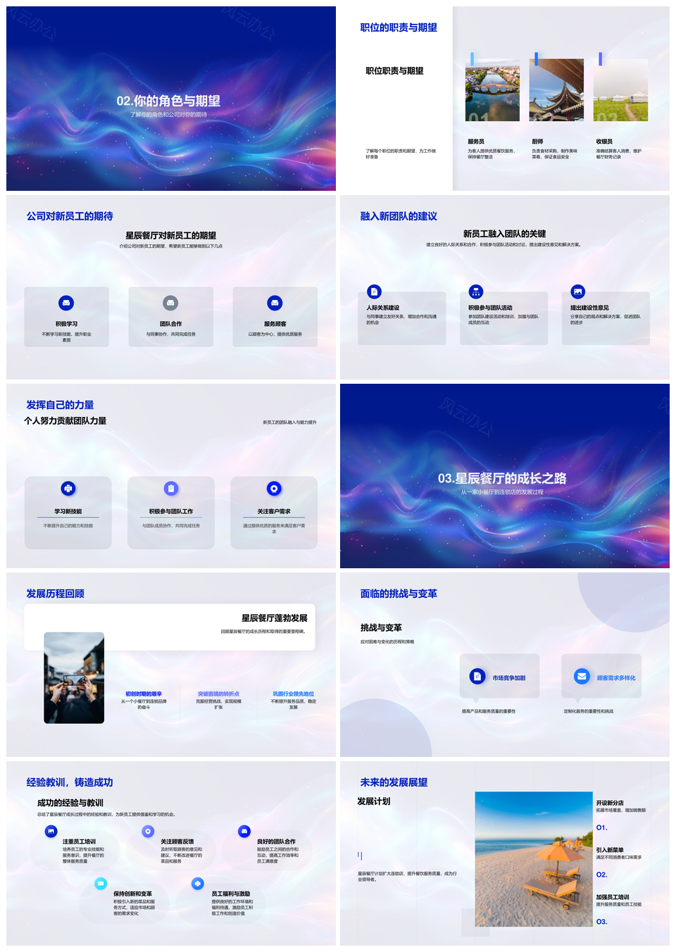 这是一张星辰餐厅新员工培训发展策略餐饮服务职责目标述职PPT模板,包含星辰餐厅、新员工、培训、发展、策略、餐饮、服务、职责、目标、述职等主题内容,也可用作星辰餐厅新员工培训发展策略、新员工培训发展策略餐饮服务、培训发展策略餐饮服务职责、发展策略餐饮服务职责目标、餐饮服务职责目标述职、星辰餐厅新员工培训、新员工培训发展策略、培训发展策略餐饮服务、发展策略餐饮服务职责、餐饮服务职责目标、职责目标述职、星辰餐厅新员工、新员工培训、培训发展策略、发展策略餐饮服务等PPT场景使用。 风云办公提供的星辰餐厅新员工培训发展策略餐饮服务职责目标述职PPT模板,下载格式为pptx,一共27页,作品中文字及图均可以修改和编辑,图片更改请在作品中右键图片并更换,文字修改请直接点击文字进行修改。