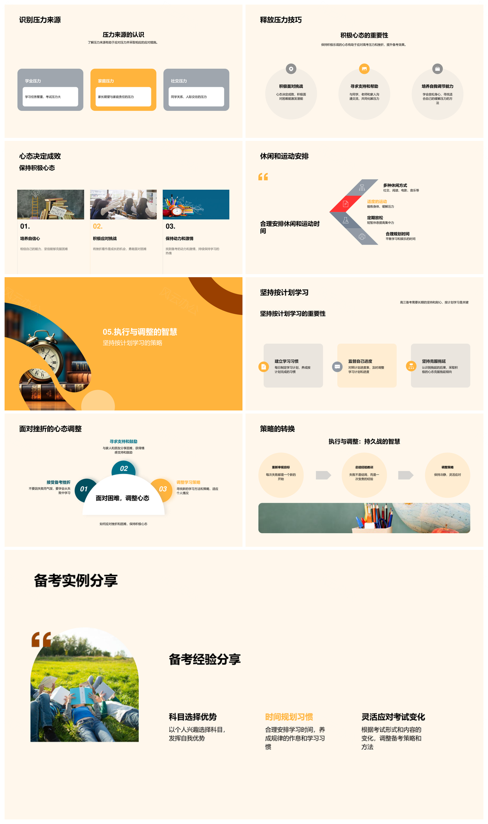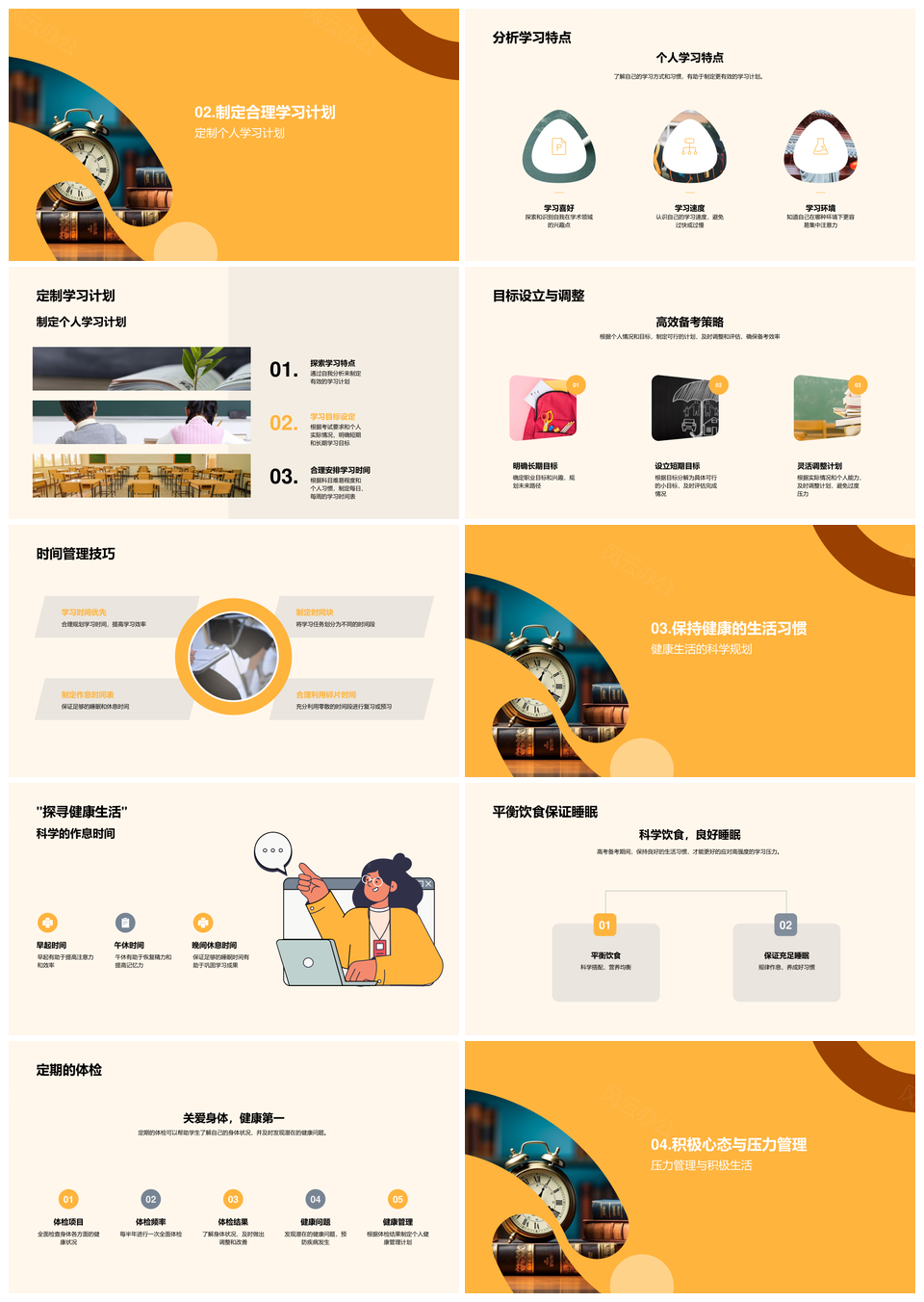 风云办公提供的高三高效备考健康作息心态指南PPT模板,下载格式为pptx,一共27页,作品中文字及图均可以修改和编辑,图片更改请在作品中右键图片并更换,文字修改请直接点击文字进行修改。