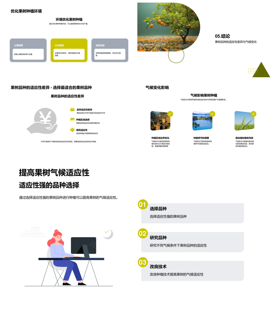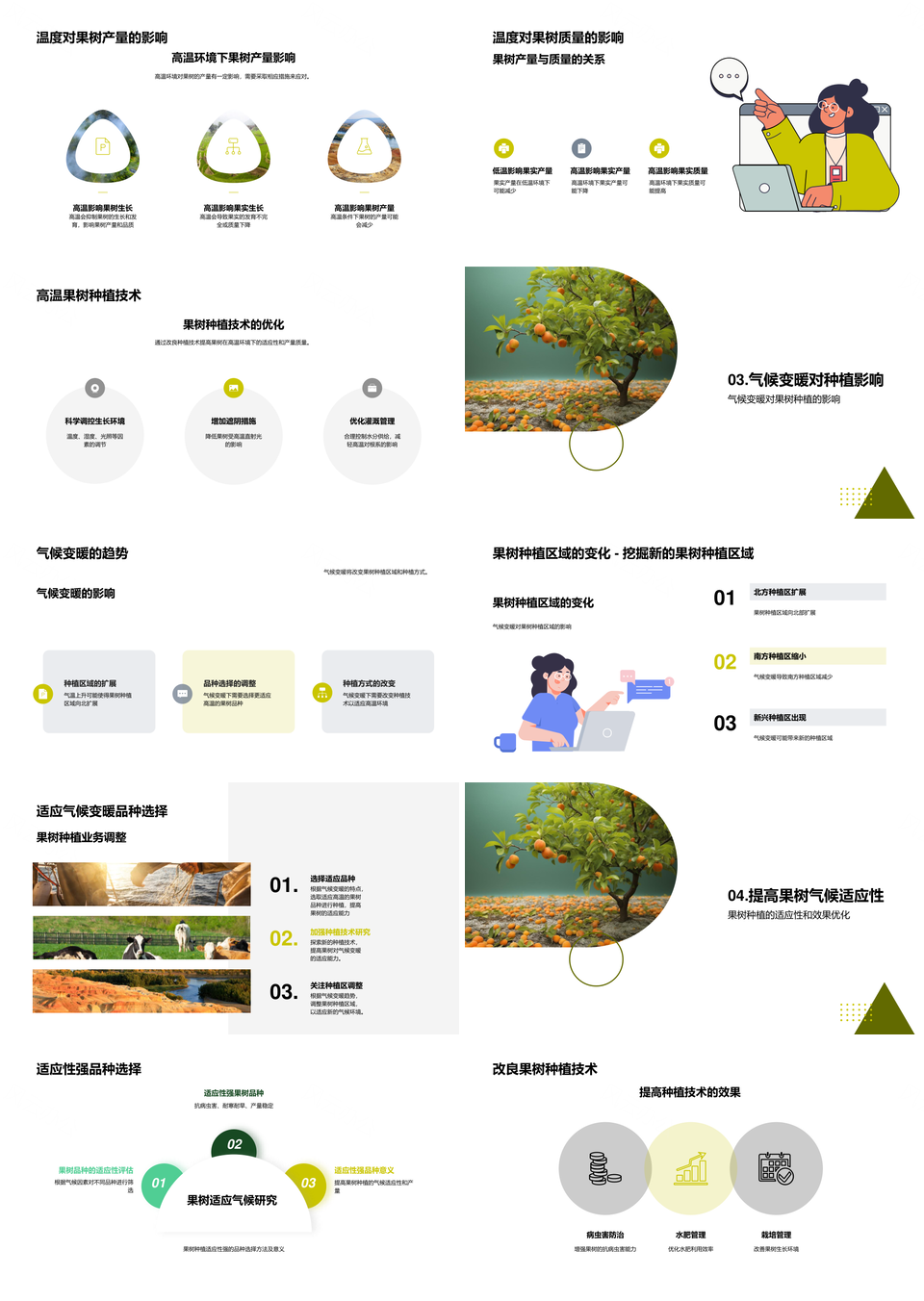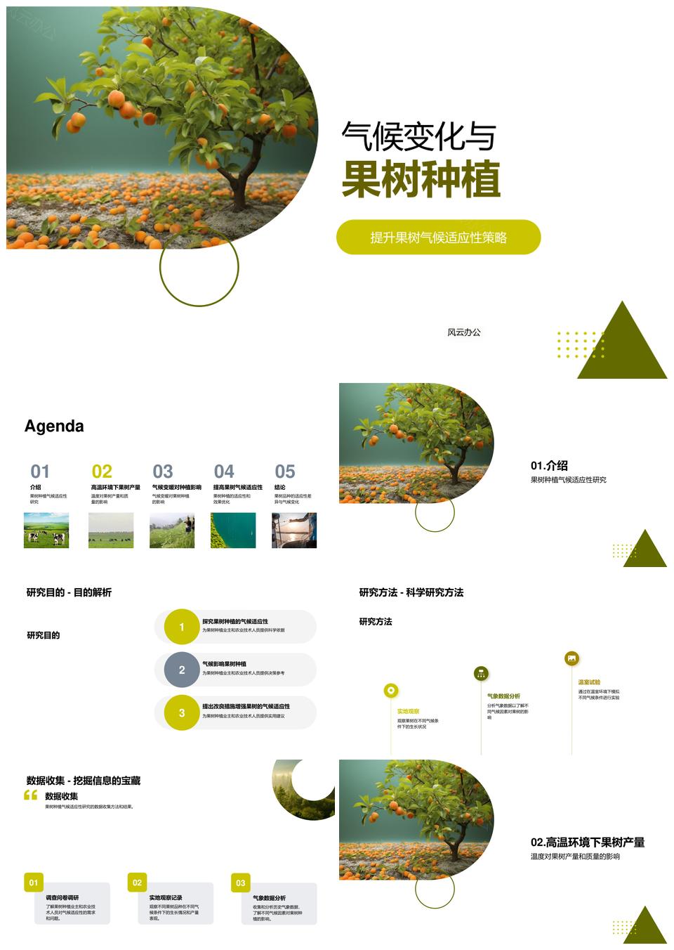 风云办公提供的气候变化下果树品种温湿度适应性研究PPT模板,下载格式为pptx,一共23页,作品中文字及图均可以修改和编辑,图片更改请在作品中右键图片并更换,文字修改请直接点击文字进行修改。