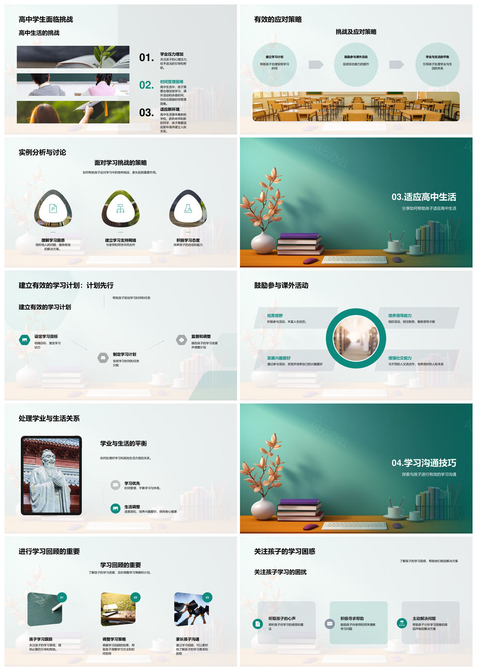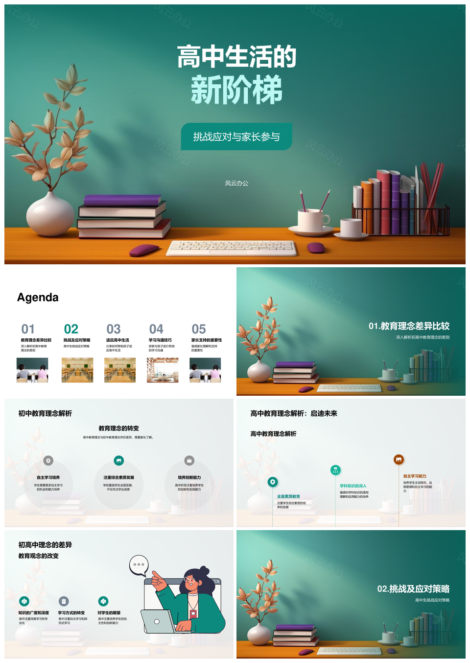 风云办公提供的高中阶梯家校共育应对学习挑战PPT模板,下载格式为pptx,一共23页,作品中文字及图均可以修改和编辑,图片更改请在作品中右键图片并更换,文字修改请直接点击文字进行修改。