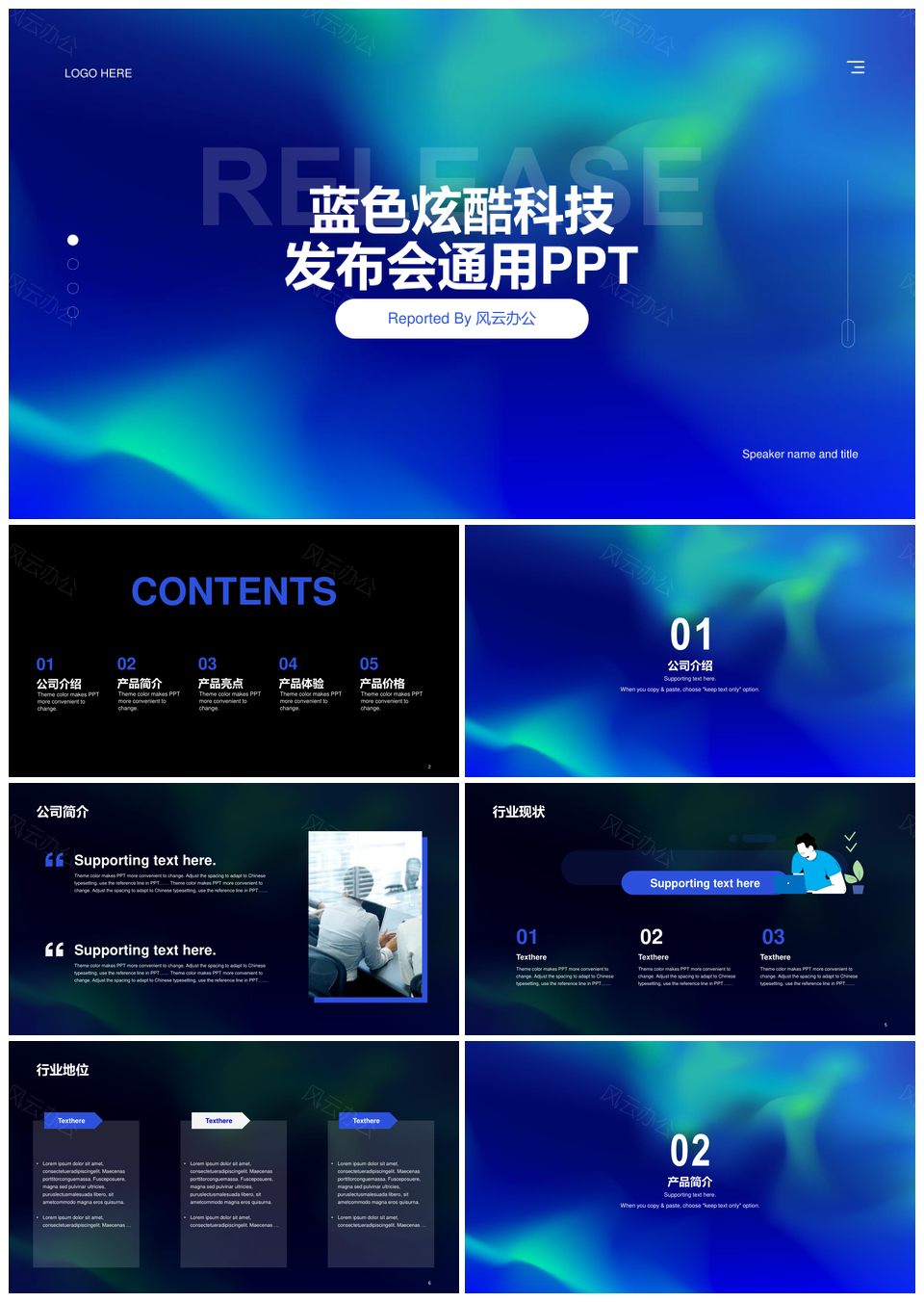 风云办公提供的蓝色炫酷科技互联网发布会PPT模板,下载格式为pptx,一共18页,作品中文字及图均可以修改和编辑,图片更改请在作品中右键图片并更换,文字修改请直接点击文字进行修改。