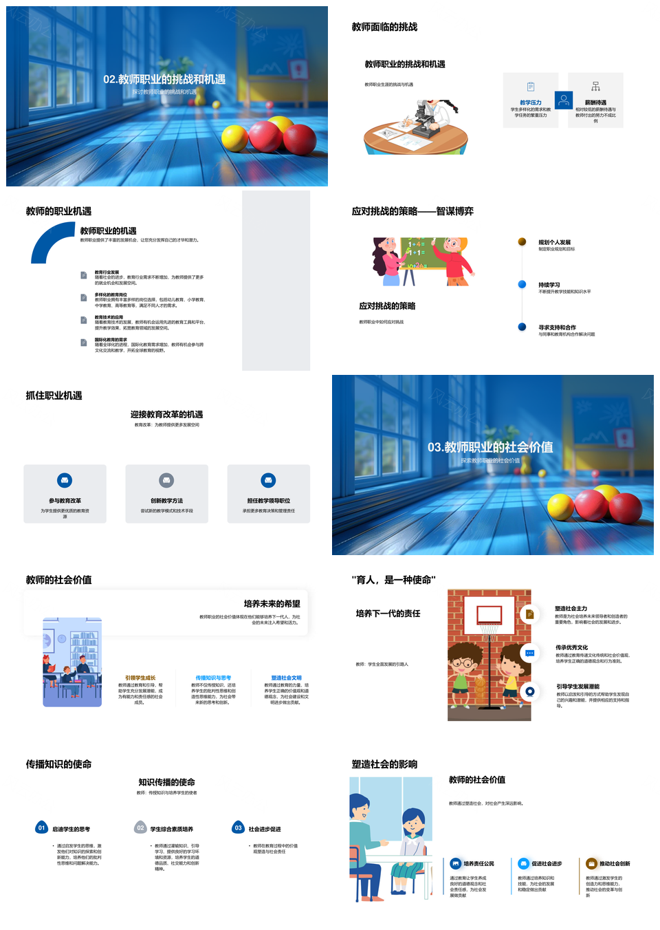 这是一张教师职业规划教育魅力职责挑战机遇发展PPT模板,包含教师、职业规划、教育、魅力、职责、挑战、机遇、发展等主题内容,也可用作教师职业规划教育魅力、职业规划教育魅力职责、教育魅力职责挑战、魅力职责挑战机遇、职责挑战机遇发展、教师职业规划教育、职业规划教育魅力、教育魅力职责、魅力职责挑战、职责挑战机遇、挑战机遇发展、教师职业规划、职业规划教育、教育魅力、职责挑战等PPT场景使用。 风云办公提供的教师职业规划教育魅力职责挑战机遇发展PPT模板,下载格式为pptx,一共28页,作品中文字及图均可以修改和编辑,图片更改请在作品中右键图片并更换,文字修改请直接点击文字进行修改。