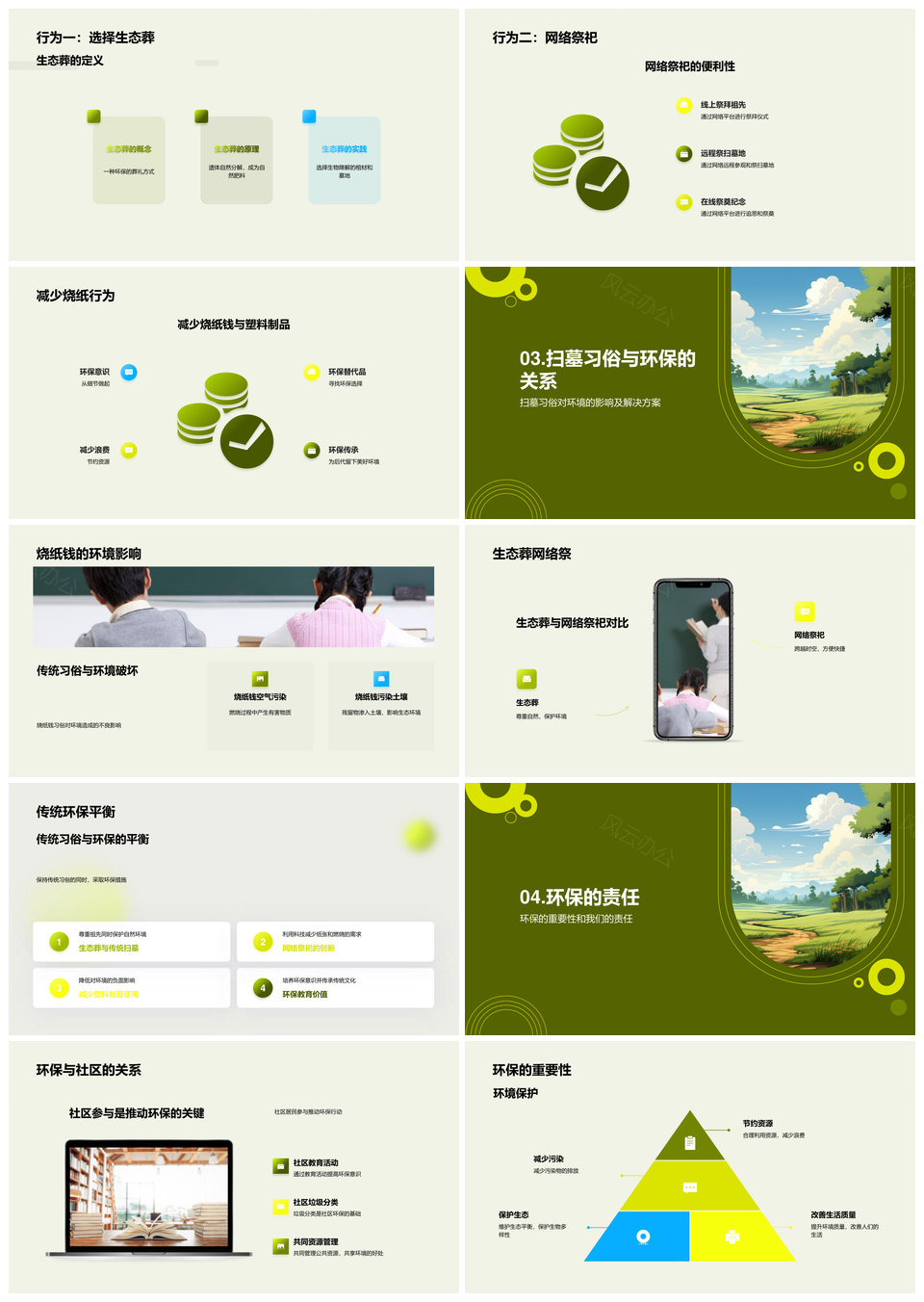 风云办公提供的清明环保新风尚生态葬网祭护生态平衡PPT模板,下载格式为pptx,一共23页,作品中文字及图均可以修改和编辑,图片更改请在作品中右键图片并更换,文字修改请直接点击文字进行修改。