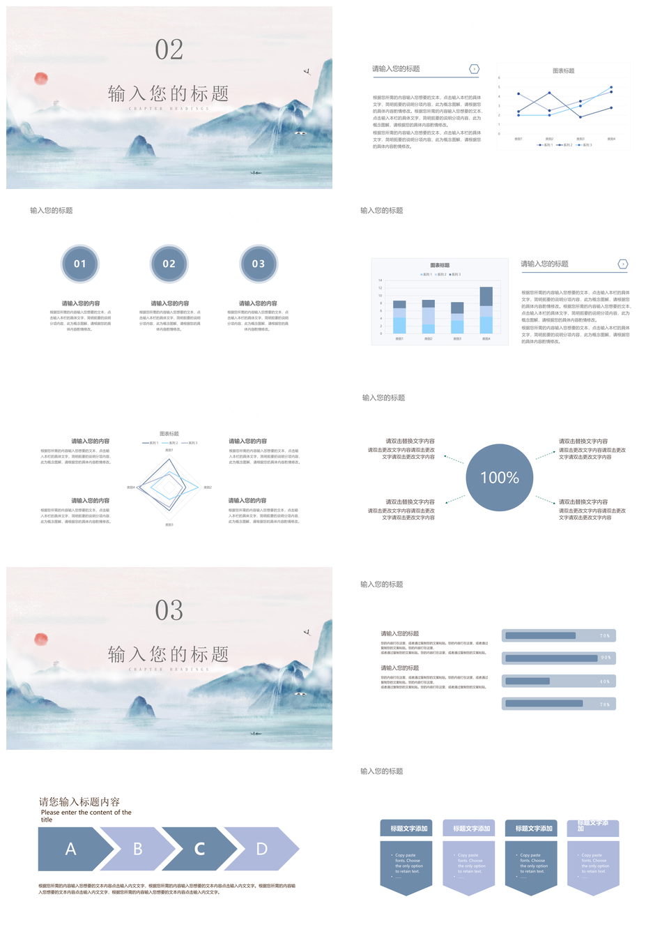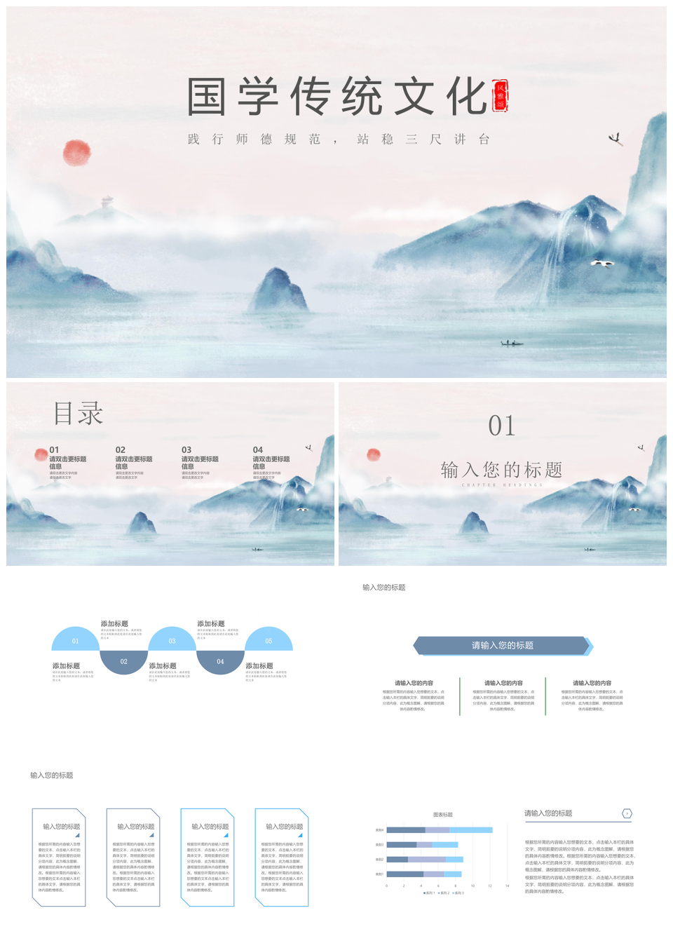 风云办公提供的青色古风国学山水画传统文化主题教育PPT模板,下载格式为pptx,一共25页,作品中文字及图均可以修改和编辑,图片更改请在作品中右键图片并更换,文字修改请直接点击文字进行修改。