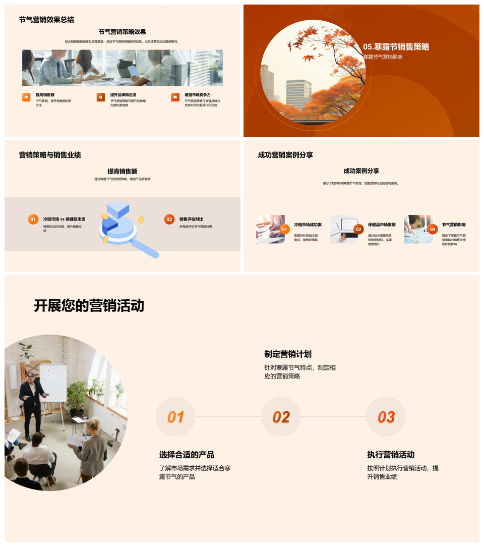 这是一张寒露节气营销攻略助力冷链保健品销售业绩提升PPT模板,包含寒露节气、营销策略、冷链保健品、销售业绩、提升等主题内容,也可用作寒露节气营销攻略助力、寒露节气助力冷链、节气营销攻略助力、营销攻略助力冷链保健品、助力冷链保健品提升、冷链保健品销售业绩提升、保健品销售业绩提升、销售业绩提升助力、寒露节气营销攻略、节气助力冷链保健、营销攻略助力提升、助力冷链销售业绩、冷链保健品销售业绩、节气营销冷链保健、营销助力提升等PPT场景使用。 风云办公提供的寒露节气营销攻略助力冷链保健品销售业绩提升PPT模板,下载格式为pptx,一共23页,作品中文字及图均可以修改和编辑,图片更改请在作品中右键图片并更换,文字修改请直接点击文字进行修改。