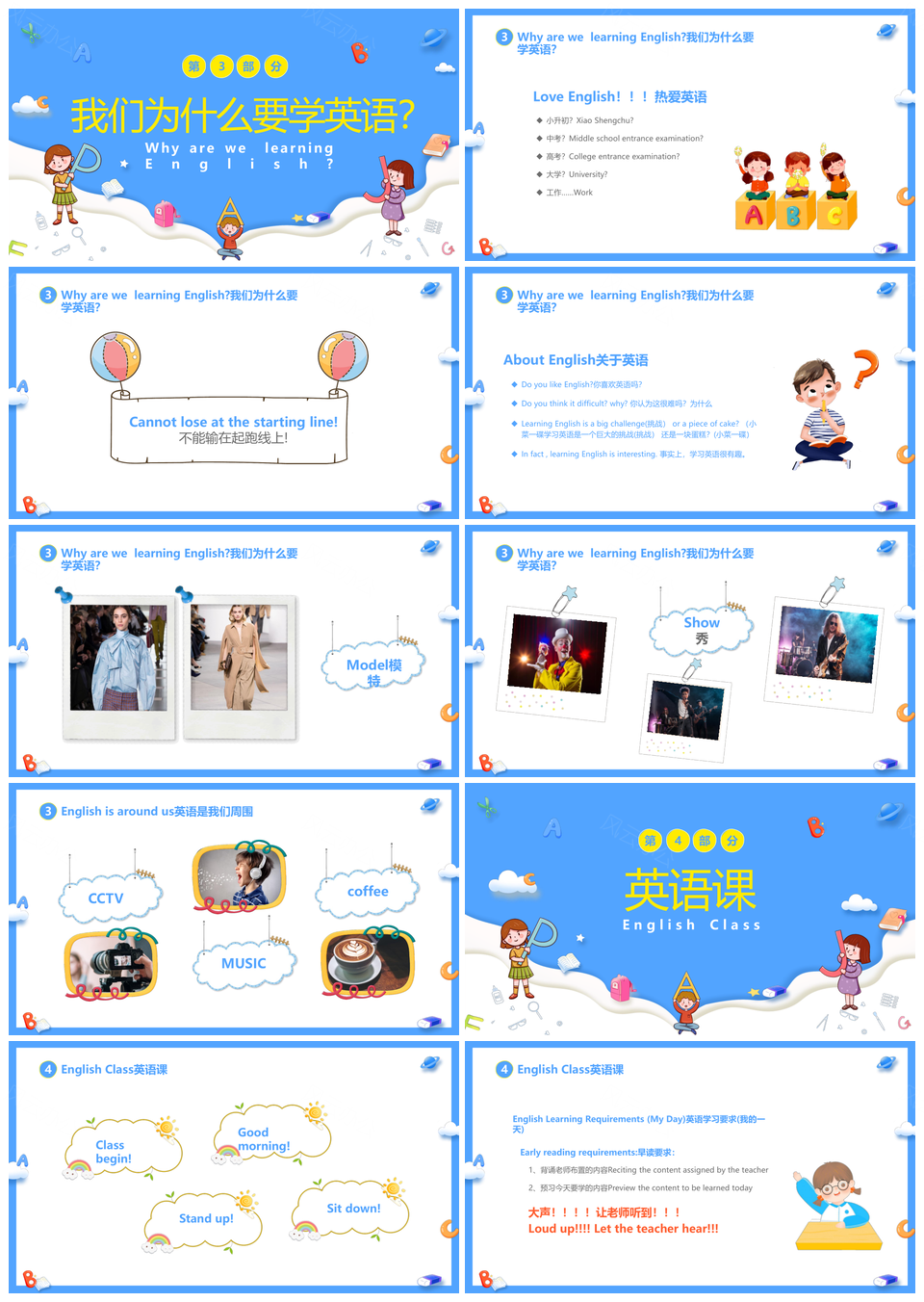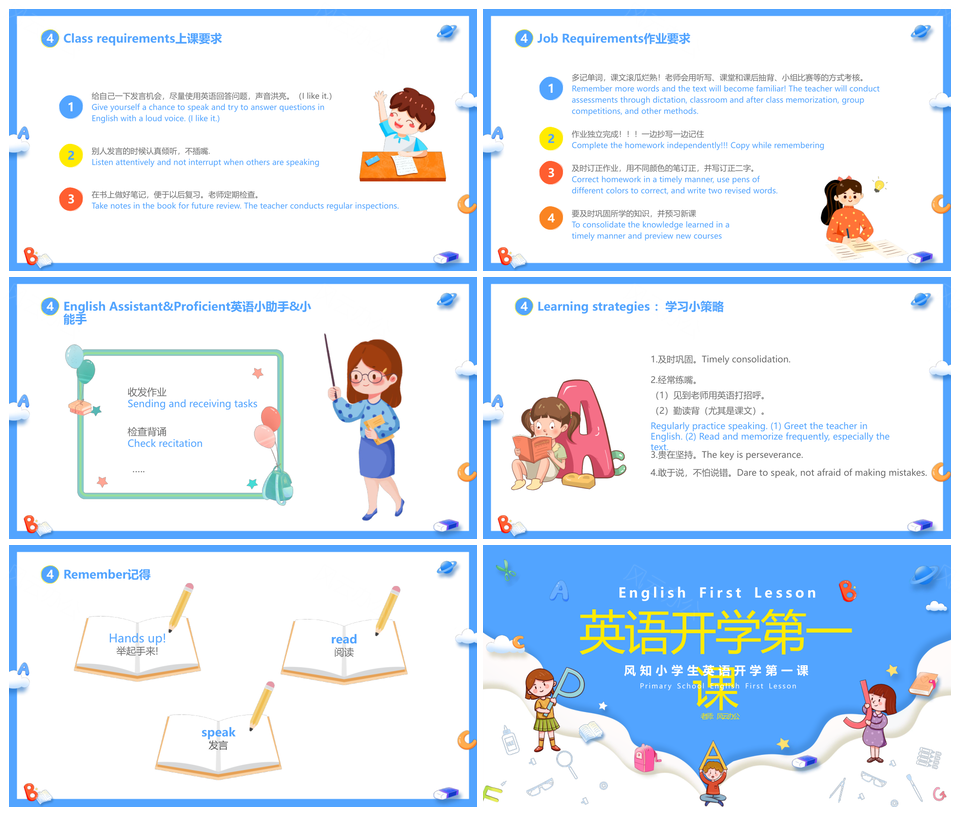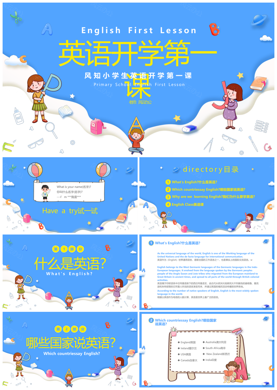 风云办公提供的蓝色卡通插画风小学英语开学第一课课件,下载格式为pptx,一共24页,作品中文字及图均可以修改和编辑,图片更改请在作品中右键图片并更换,文字修改请直接点击文字进行修改。