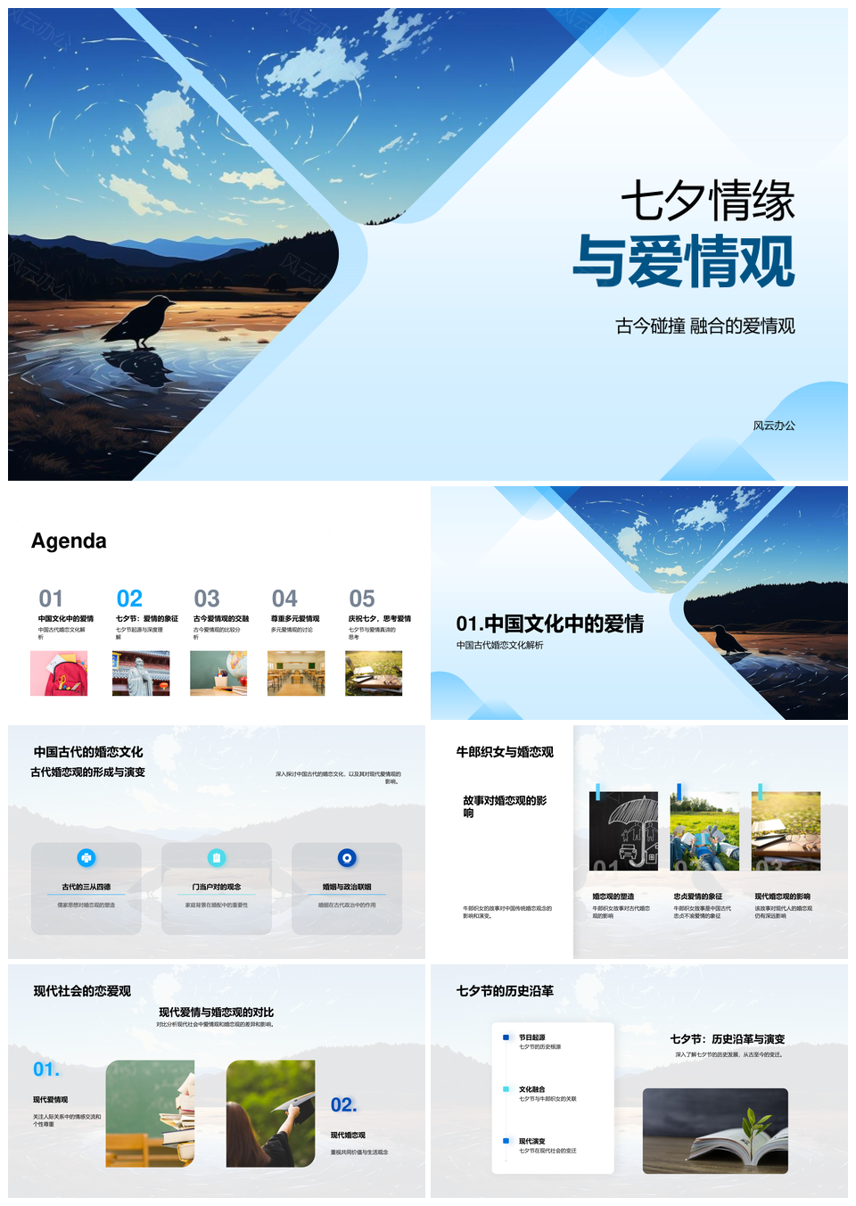 这是一张七夕牛郎织女鹊桥映多元爱情观PPT模板,包含七夕、牛郎织女、鹊桥、多元爱情观等主题内容,也可用作七夕牛郎织女鹊桥、七夕牛郎织女、牛郎织女鹊桥、织女鹊桥多元、鹊桥多元爱情观、七夕牛郎、牛郎织女、织女鹊桥、鹊桥多元、多元爱情观、七夕鹊桥、七夕织女、鹊桥爱情观、牛郎鹊桥、七夕爱情观等PPT场景使用。 风云办公提供的七夕牛郎织女鹊桥映多元爱情观PPT模板,下载格式为pptx,一共24页,作品中文字及图均可以修改和编辑,图片更改请在作品中右键图片并更换,文字修改请直接点击文字进行修改。