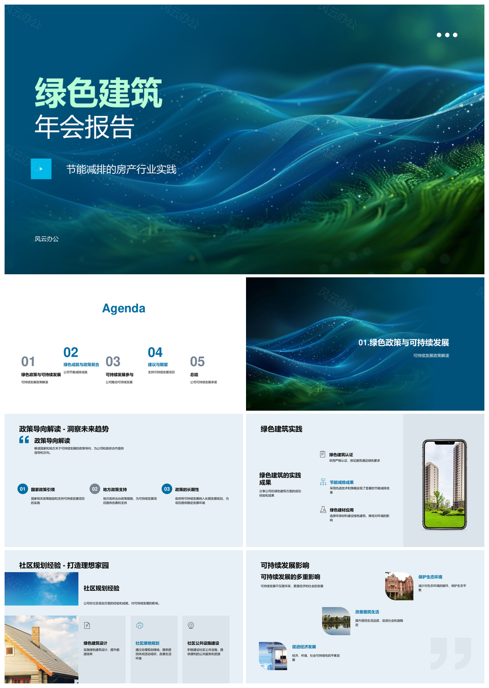 风云办公提供的绿色建筑房产可持续发展政策年会PPT模板,下载格式为pptx,一共25页,作品中文字及图均可以修改和编辑,图片更改请在作品中右键图片并更换,文字修改请直接点击文字进行修改。