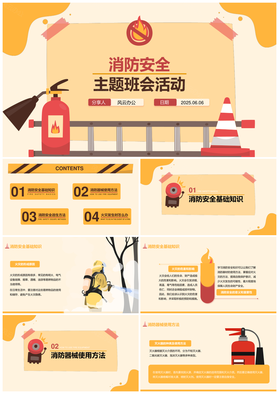 风云办公提供的2025黄色插画风消防安全主题班会PPT模板,下载格式为pptx,一共15页,作品中文字及图均可以修改和编辑,图片更改请在作品中右键图片并更换,文字修改请直接点击文字进行修改。