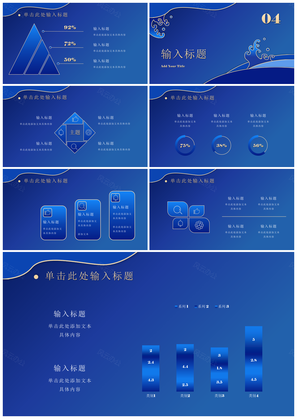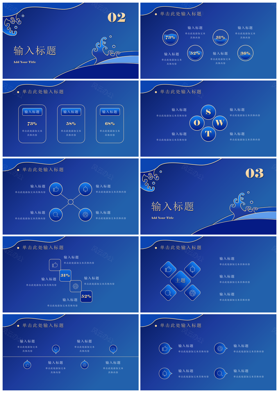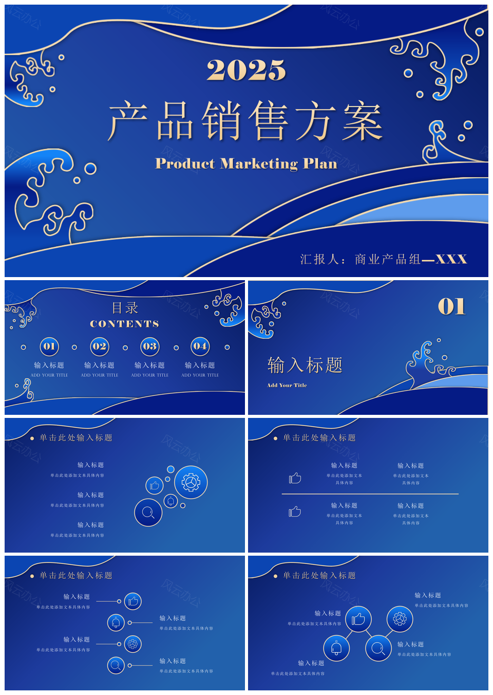 风云办公提供的2025蓝色国风奢华产品销售方案PPT模板,下载格式为pptx,一共25页,作品中文字及图均可以修改和编辑,图片更改请在作品中右键图片并更换,文字修改请直接点击文字进行修改。