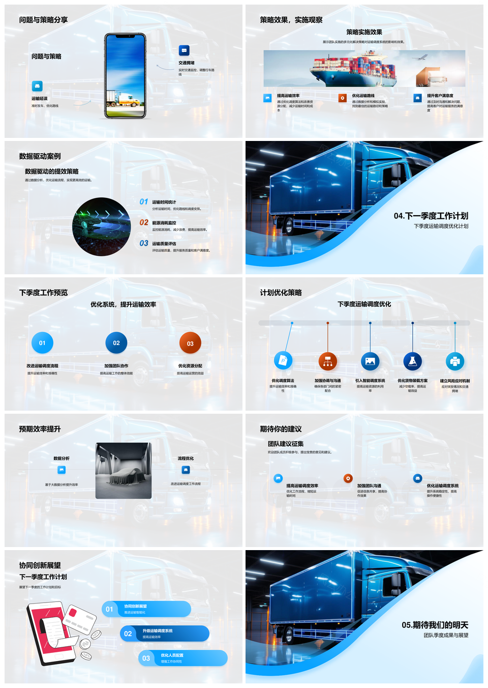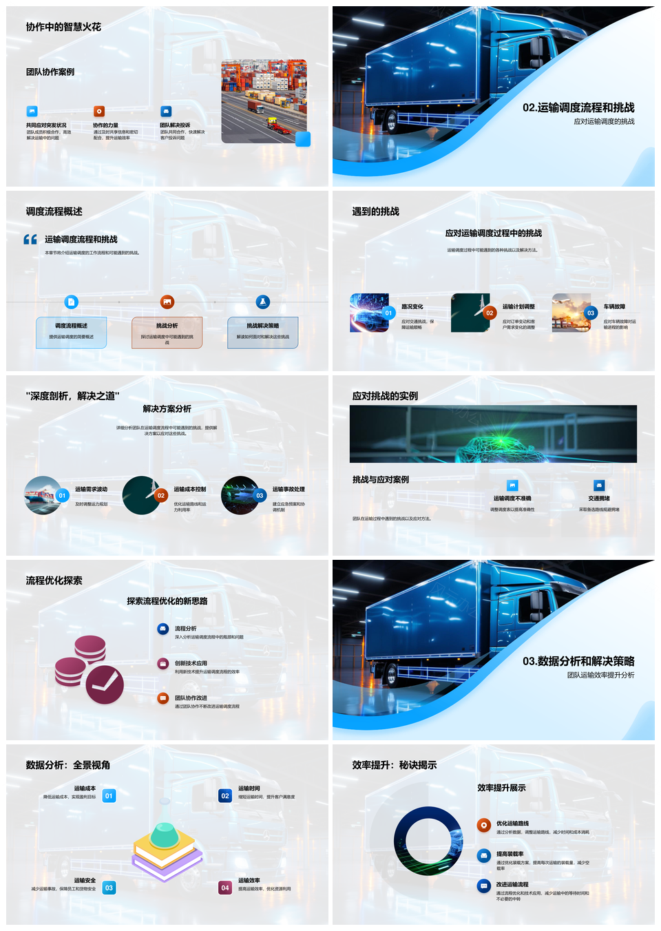 风云办公提供的运输调度策略与团队协作效率提升实践PPT模板,下载格式为pptx,一共33页,作品中文字及图均可以修改和编辑,图片更改请在作品中右键图片并更换,文字修改请直接点击文字进行修改。