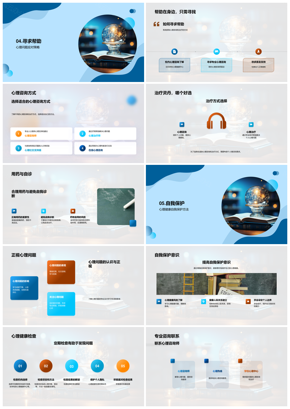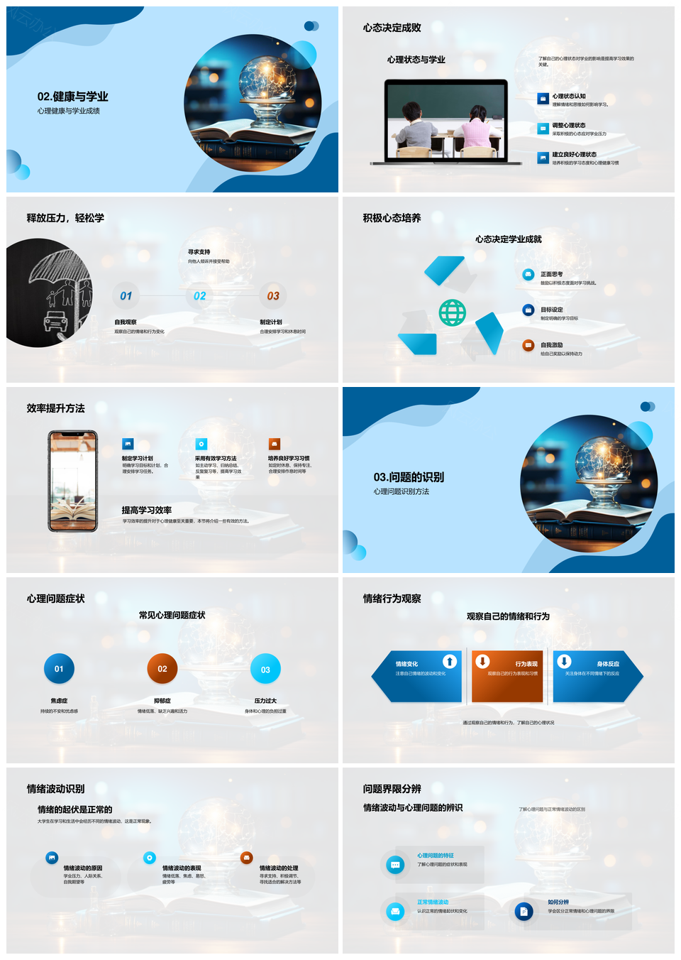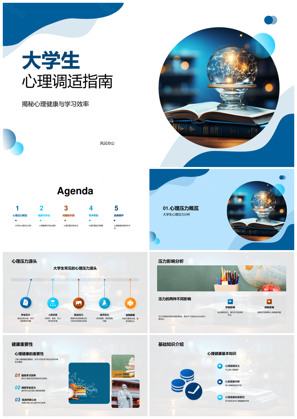 风云办公提供的大学生心理健康调适学习效率指南PPT模板,下载格式为pptx,一共28页,作品中文字及图均可以修改和编辑,图片更改请在作品中右键图片并更换,文字修改请直接点击文字进行修改。