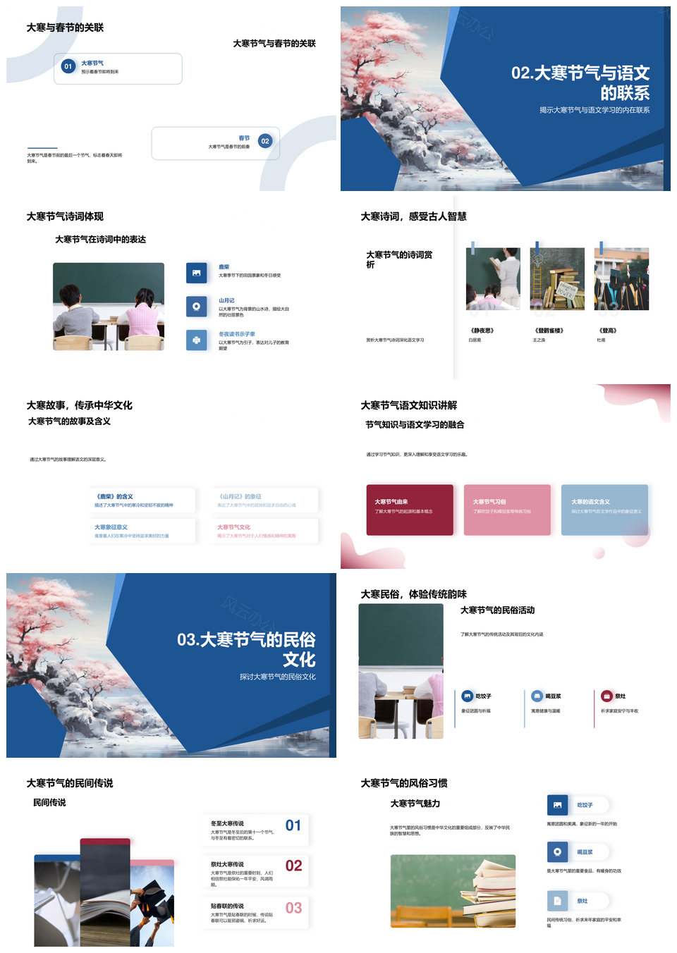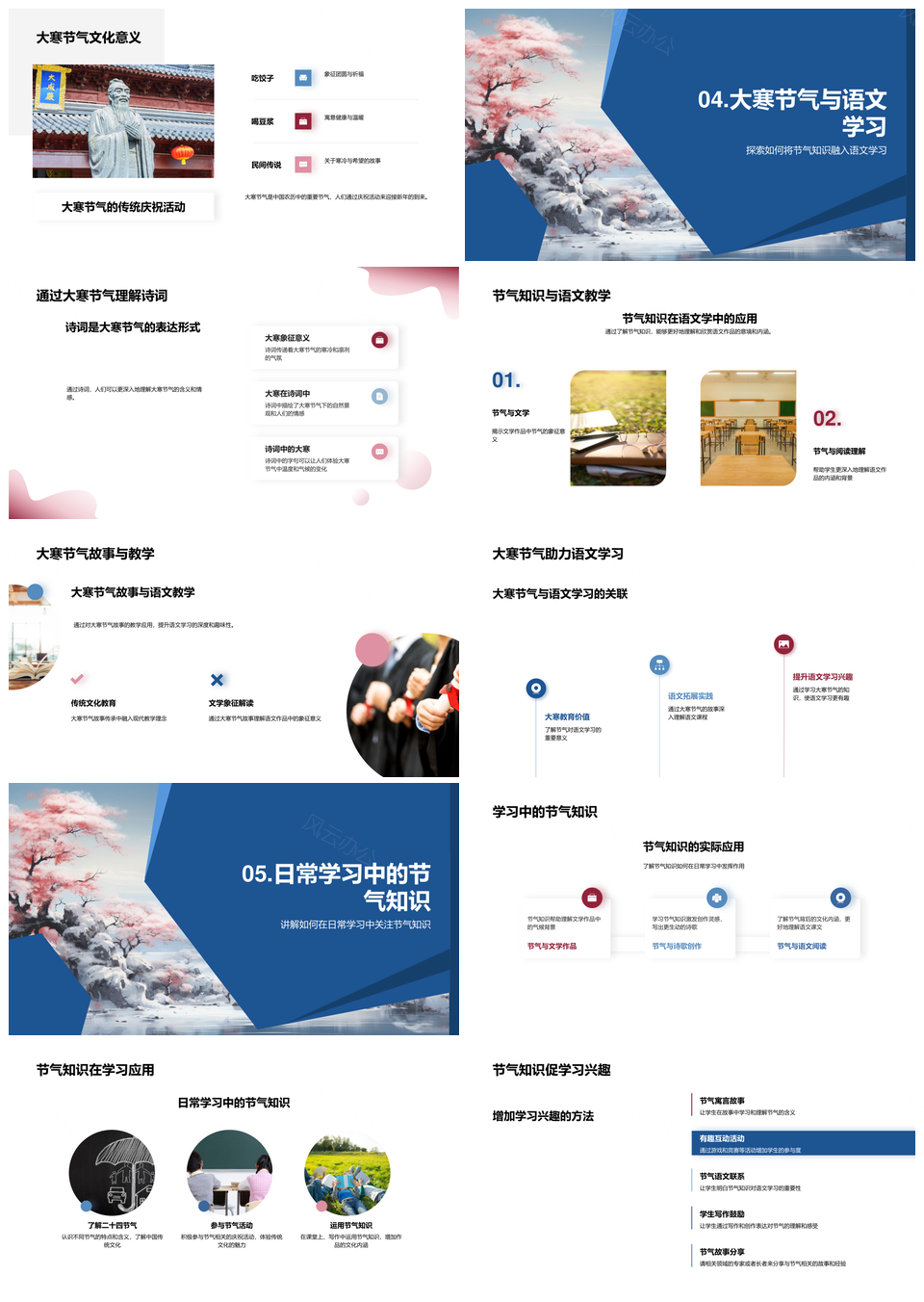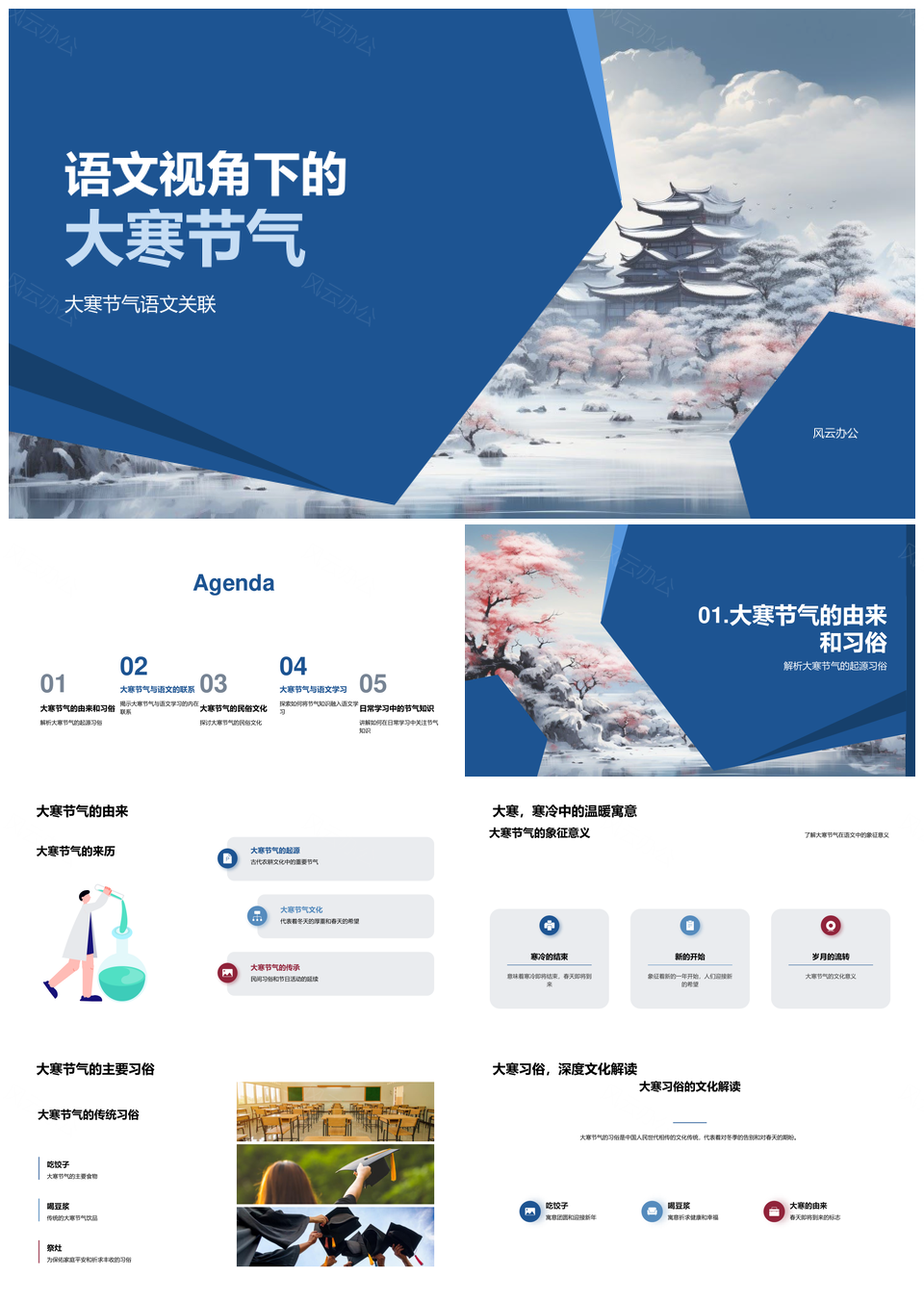 风云办公提供的大寒节气语文学习诗词书法民俗文化PPT模板,下载格式为pptx,一共29页,作品中文字及图均可以修改和编辑,图片更改请在作品中右键图片并更换,文字修改请直接点击文字进行修改。