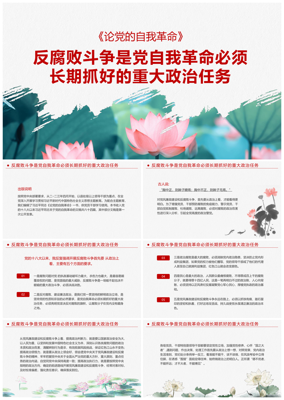 风云办公提供的党的自我革命引领反腐败斗争党课教育PPT模板,下载格式为pptx,一共10页,作品中文字及图均可以修改和编辑,图片更改请在作品中右键图片并更换,文字修改请直接点击文字进行修改。