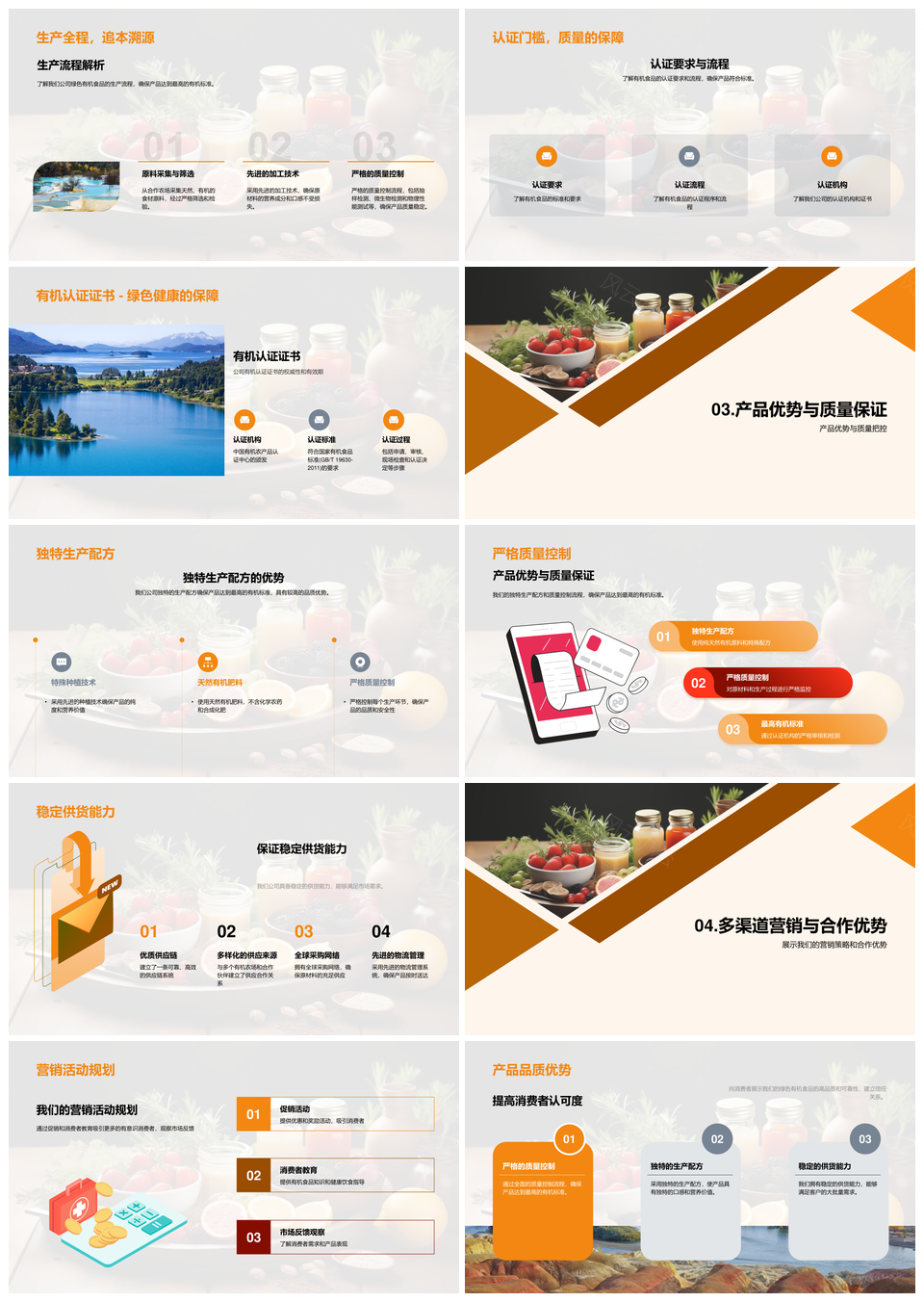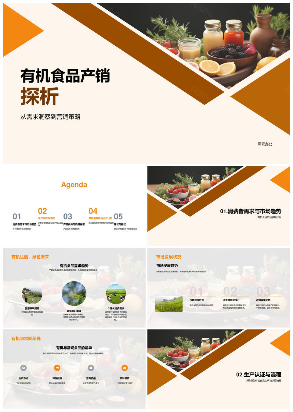 风云办公提供的有机食品认证质控产销策略与需求分析PPT模板,下载格式为pptx,一共23页,作品中文字及图均可以修改和编辑,图片更改请在作品中右键图片并更换,文字修改请直接点击文字进行修改。