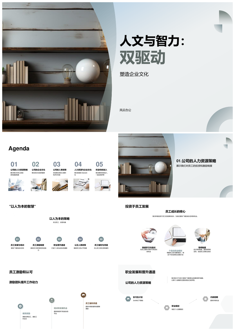 风云办公提供的人文智力双驱企业文化与员工发展PPT模板,下载格式为pptx,一共33页,作品中文字及图均可以修改和编辑,图片更改请在作品中右键图片并更换,文字修改请直接点击文字进行修改。