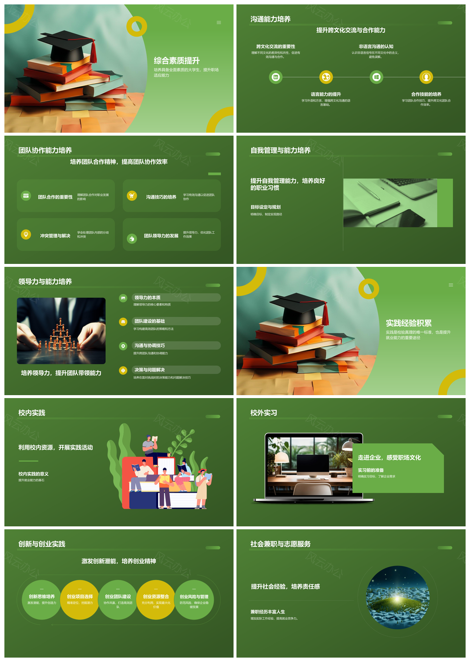这是一张大学生就业能力培养实践与创新提升展示PPT模板,包含大学生就业能力、培养、实践、创新、提升、展示等主题内容,也可用作大学生就业能力培养实践与创新提升展示、就业能力培养实践与创新提升、能力培养实践创新提升展示、培养实践与创新提升展示、大学生就业能力培养实践、就业能力培养实践创新、能力培养实践与创新提升、实践与创新提升展示、大学生就业能力培养、就业能力培养实践、能力培养实践创新、培养实践创新提升、实践创新提升展示、大学生就业能力、就业能力培养、能力培养实践、培养实践创新、实践创新提升、创新提升展示、大学生就业、就业能力、能力培养、培养实践、实践创新、创新提升、提升展示等PPT场景使用。 风云办公提供的大学生就业能力培养实践与创新提升展示PPT模板,下载格式为pptx,一共18页,作品中文字及图均可以修改和编辑,图片更改请在作品中右键图片并更换,文字修改请直接点击文字进行修改。