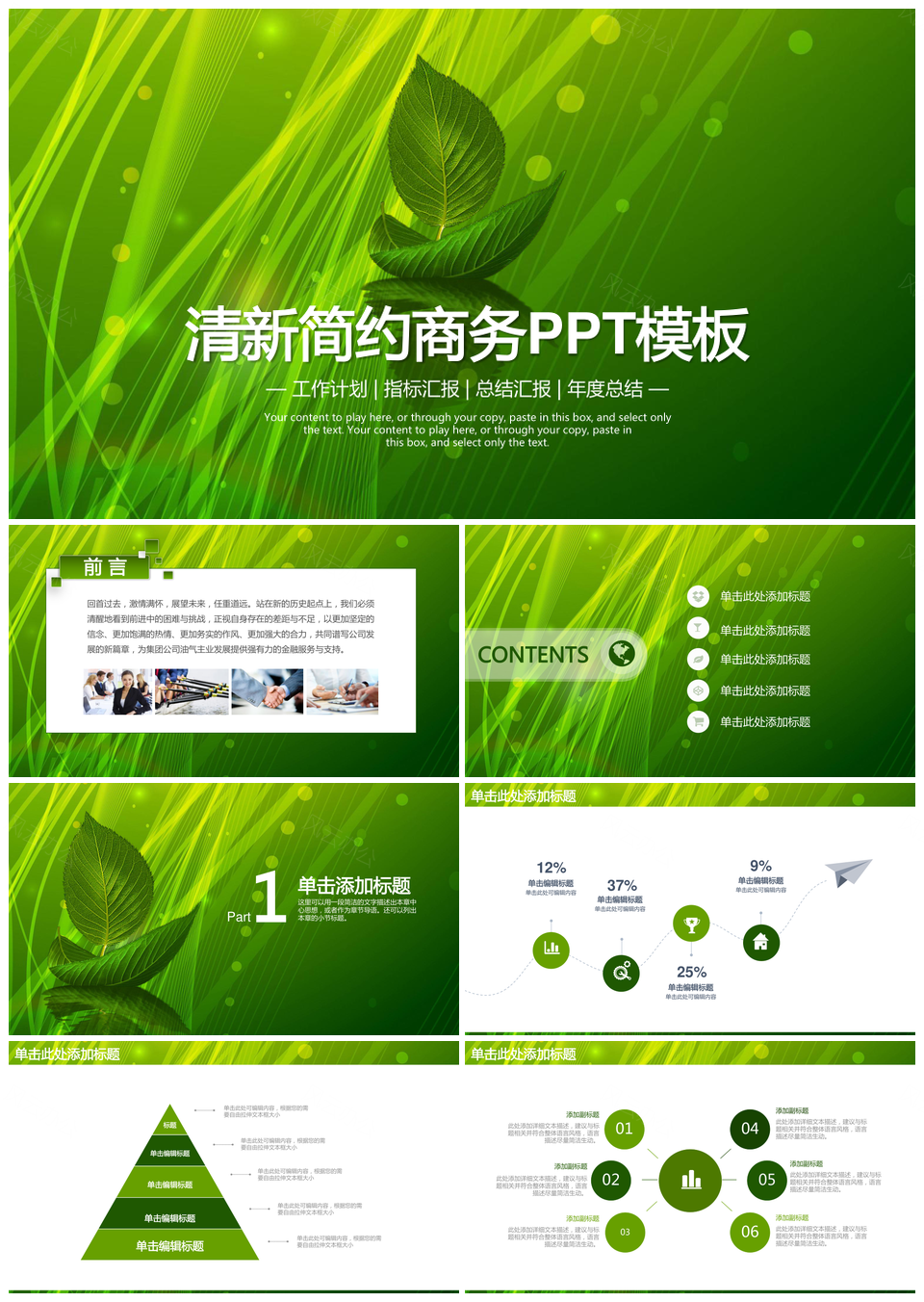 风云办公提供的绿色商务工作计划述职总结PPT模板专业高清,下载格式为pptx,一共41页,作品中文字及图均可以修改和编辑,图片更改请在作品中右键图片并更换,文字修改请直接点击文字进行修改。