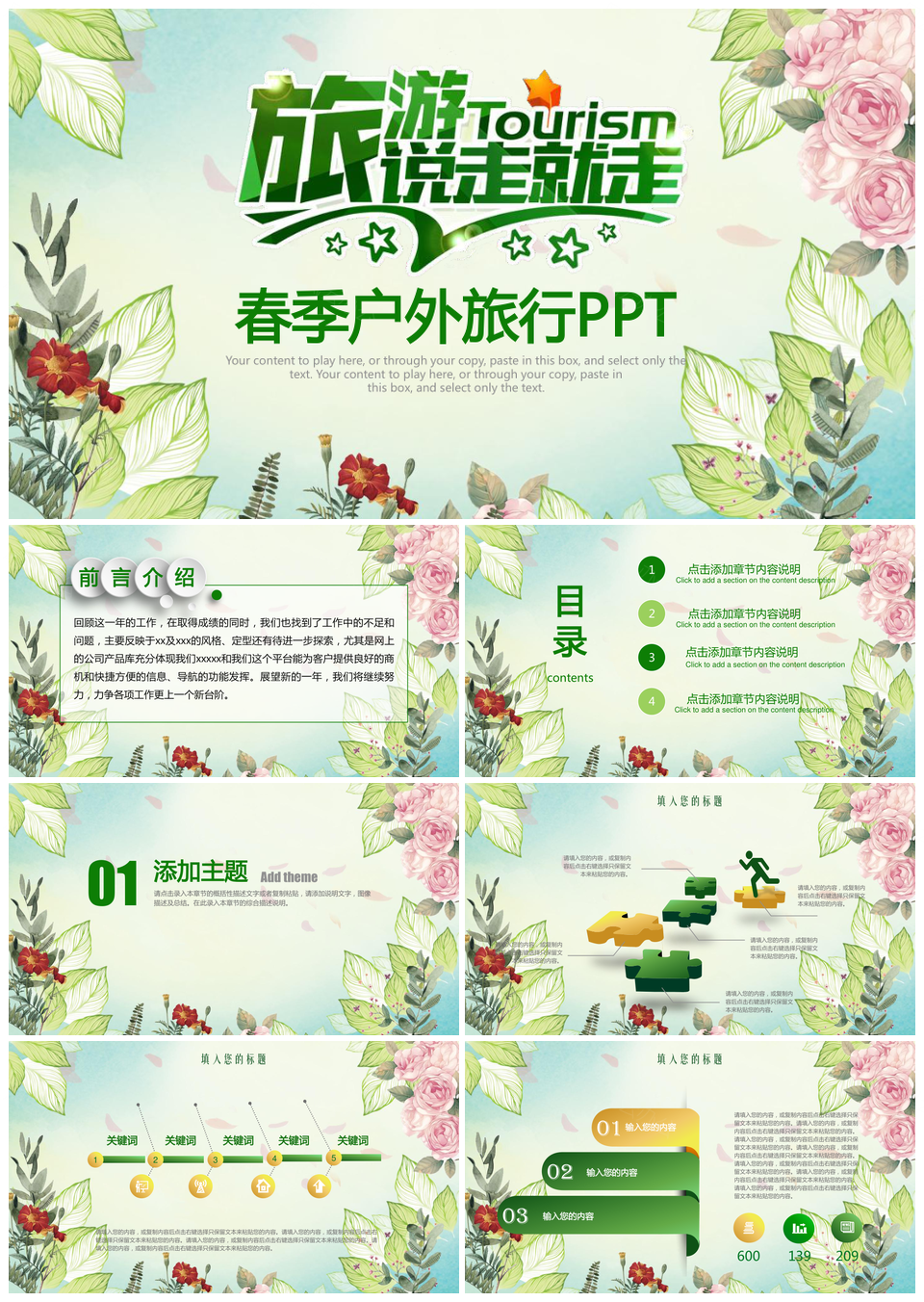 风云办公提供的绿色生态春季旅游手绘PPT模板精美设计,下载格式为pptx,一共33页,作品中文字及图均可以修改和编辑,图片更改请在作品中右键图片并更换,文字修改请直接点击文字进行修改。