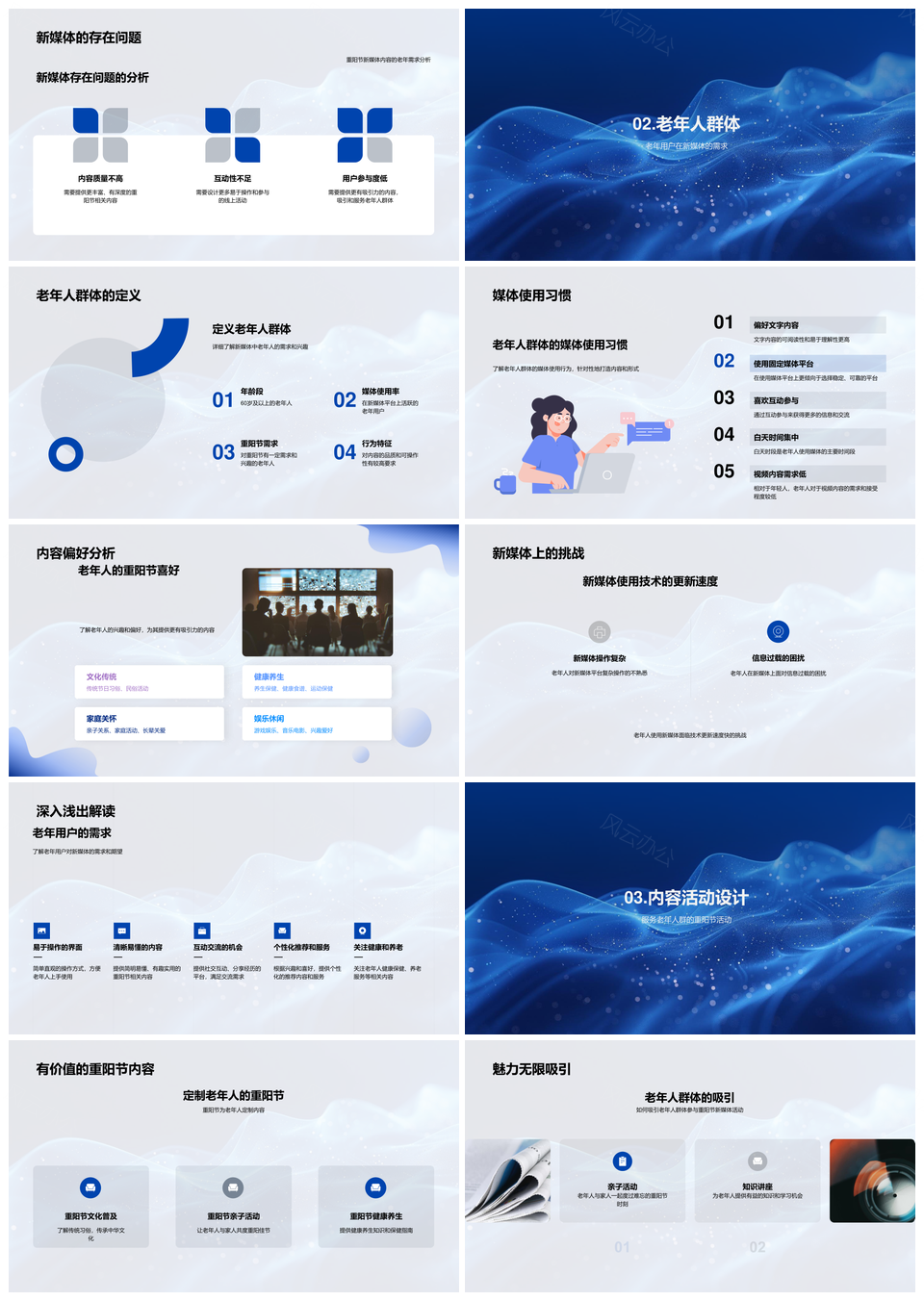 这是一张重阳节老年群体新媒体运营策略PPT模板,包含重阳节、老年群体、新媒体、运营策略等主题内容,也可用作重阳节老年群体新媒体运营、老年群体新媒体运营策略、重阳节老年群体新媒体、重阳节老年群体运营、老年群体新媒体运营、新媒体运营策略、重阳节新媒体运营、老年群体运营策略、新媒体运营、老年群体新媒体、运营策略、重阳节运营、重阳节策略、老年群体策略、新媒体策略等PPT场景使用。