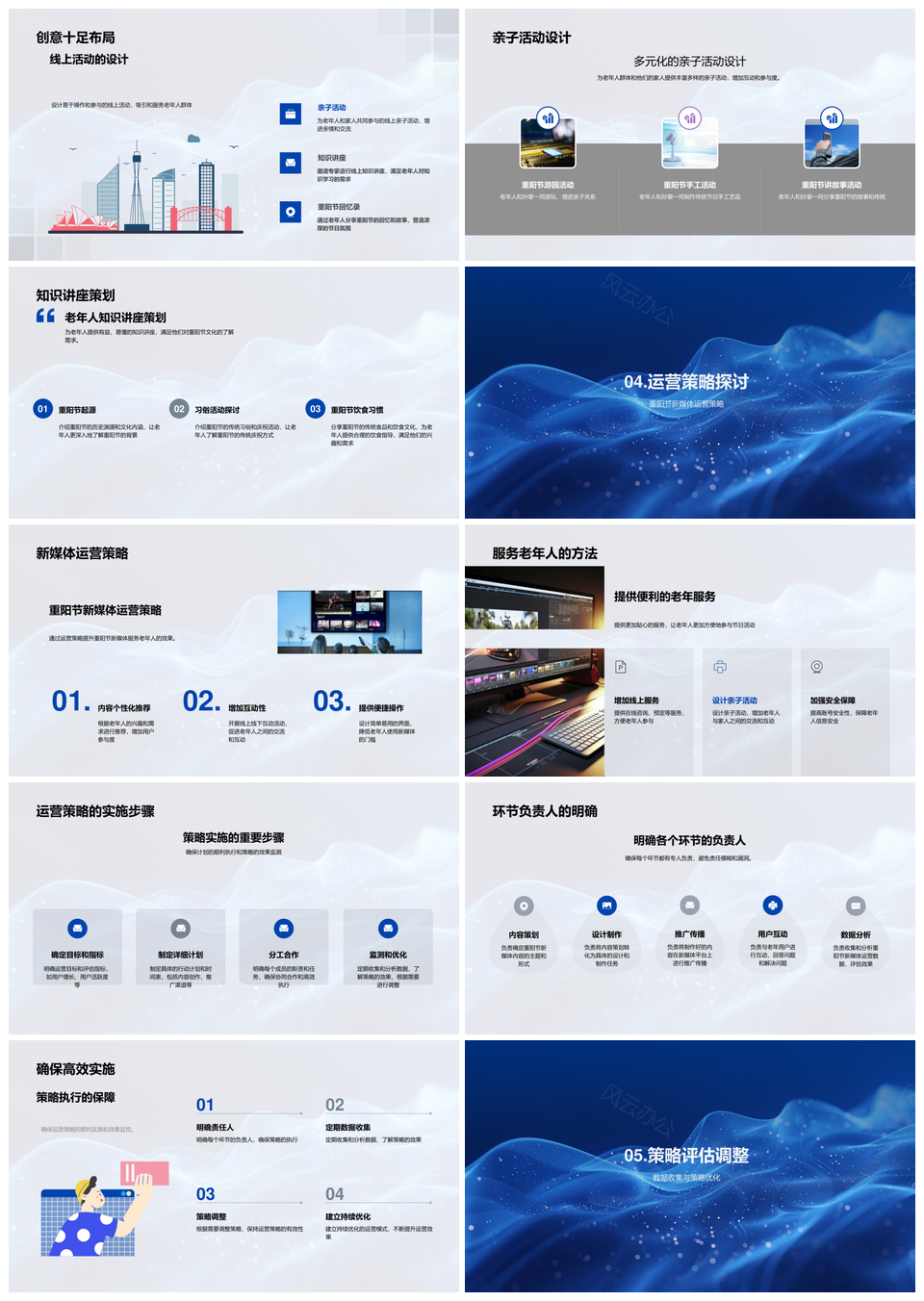 风云办公提供的重阳节老年群体新媒体运营策略PPT模板,下载格式为pptx,一共33页,作品中文字及图均可以修改和编辑,图片更改请在作品中右键图片并更换,文字修改请直接点击文字进行修改。